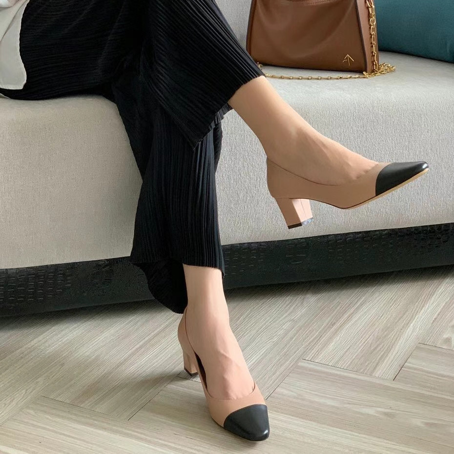 2024新款真羊皮高跟鞋女单鞋5CM粗跟拼色小香风百搭外贸原单欧美
