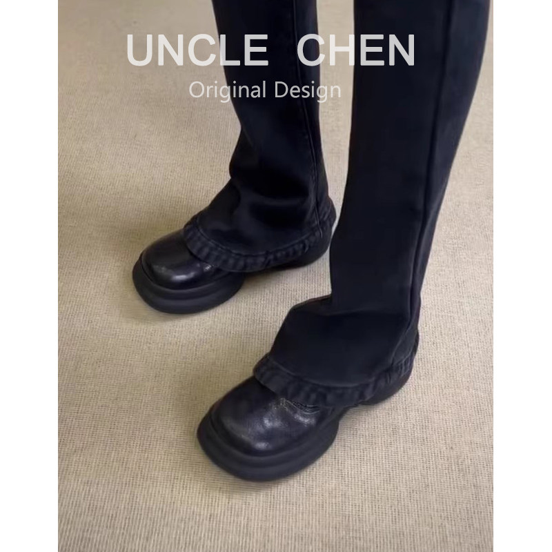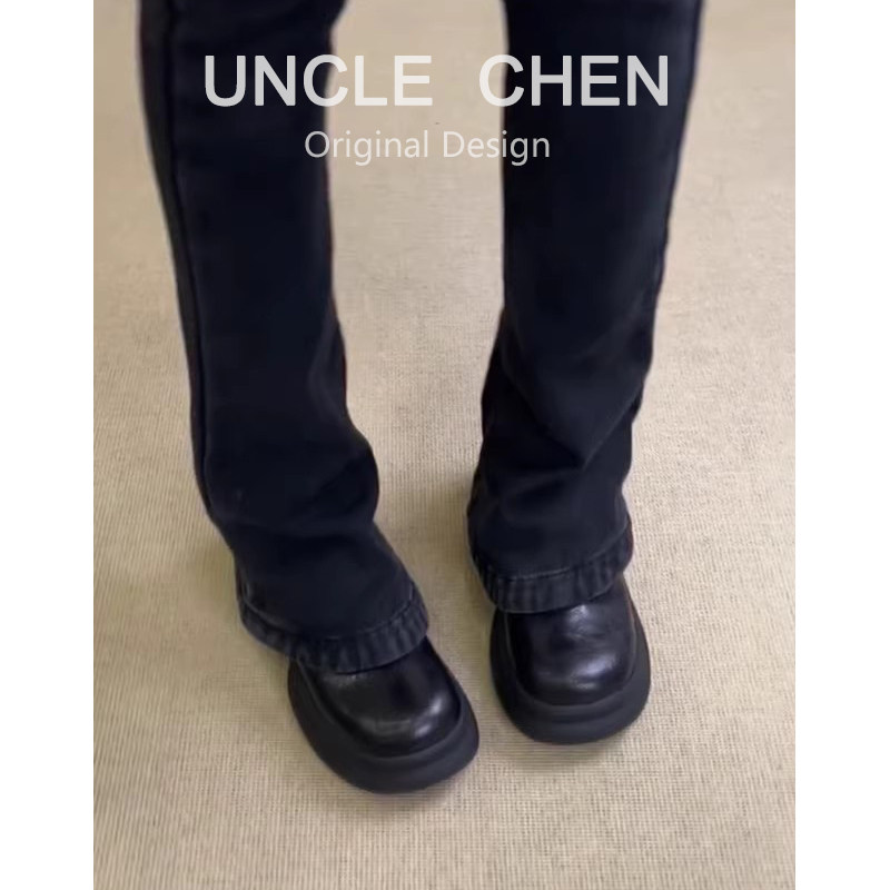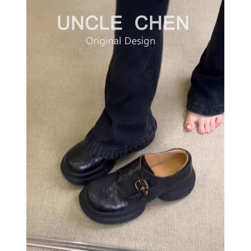 羊皮版~英伦风厚底圆头皮带扣乐福鞋女黑色通勤单鞋小个子小皮鞋