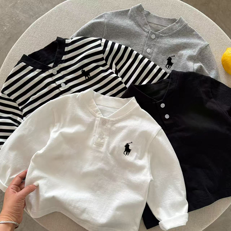 春秋季纯棉白色长袖T恤衫男童女童亨利领长袖T恤卡通洋气打底上衣