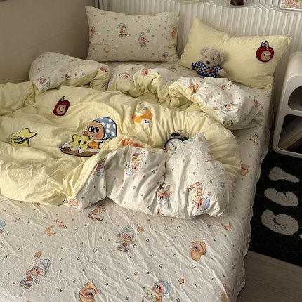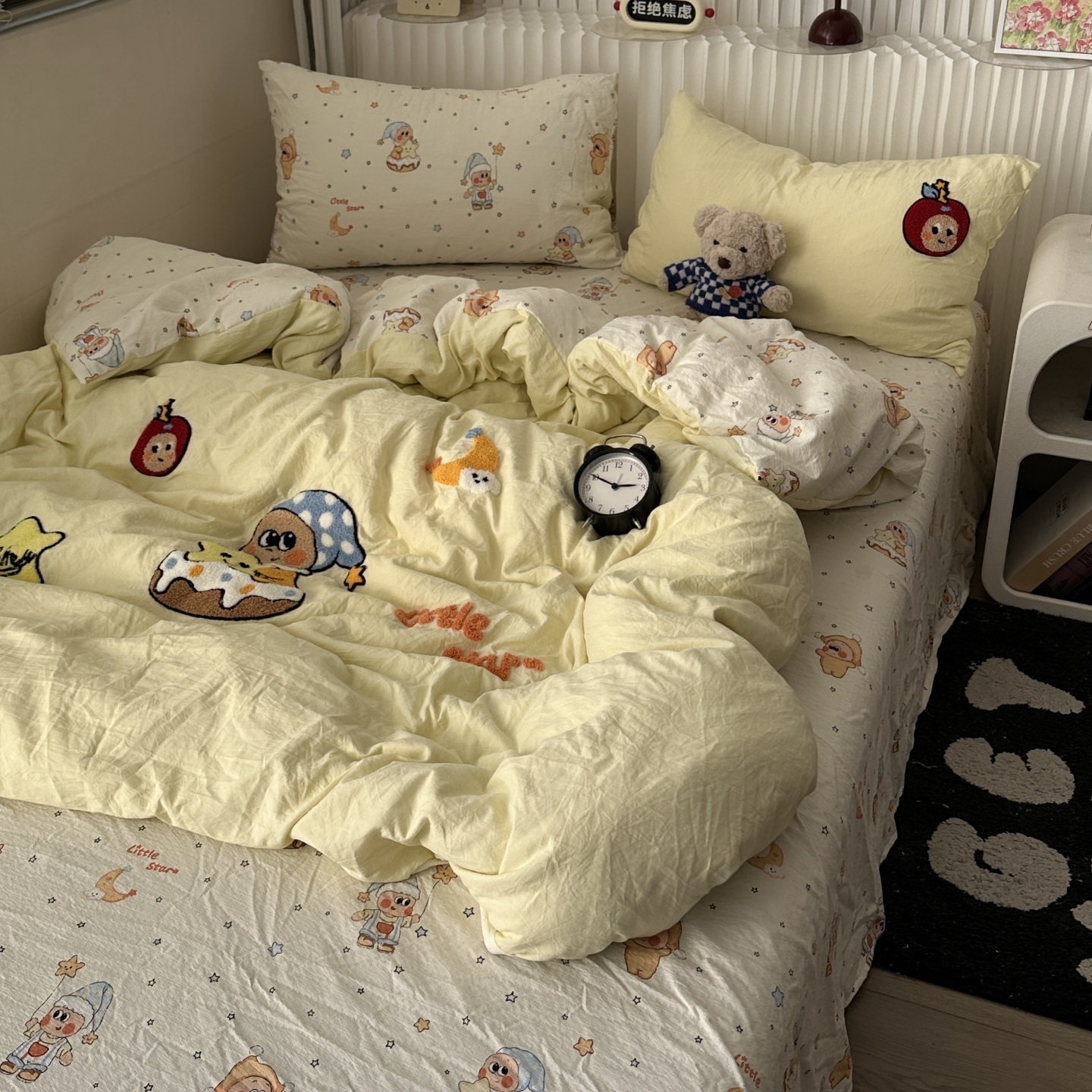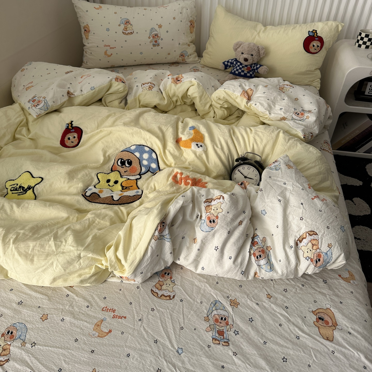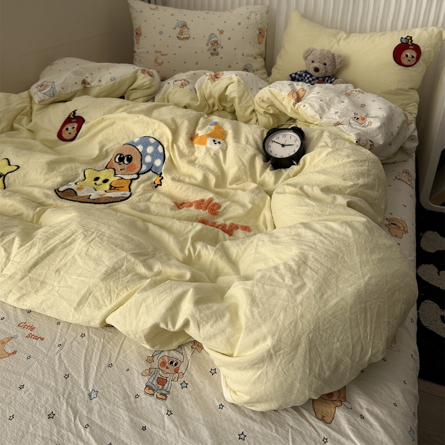 卡通ins可爱星星人毛巾绣全棉四件套纯棉床单学生宿舍三件套床笠