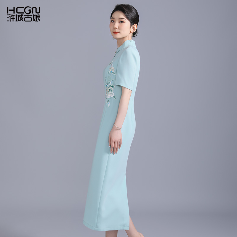 浒城古娘新款刺绣气质优雅立领修身新中式国风改良旗袍连衣裙女夏
