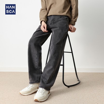 hansca烟灰色牛仔裤男2025秋季重磅阔腿宽松直筒水洗青少年长裤子