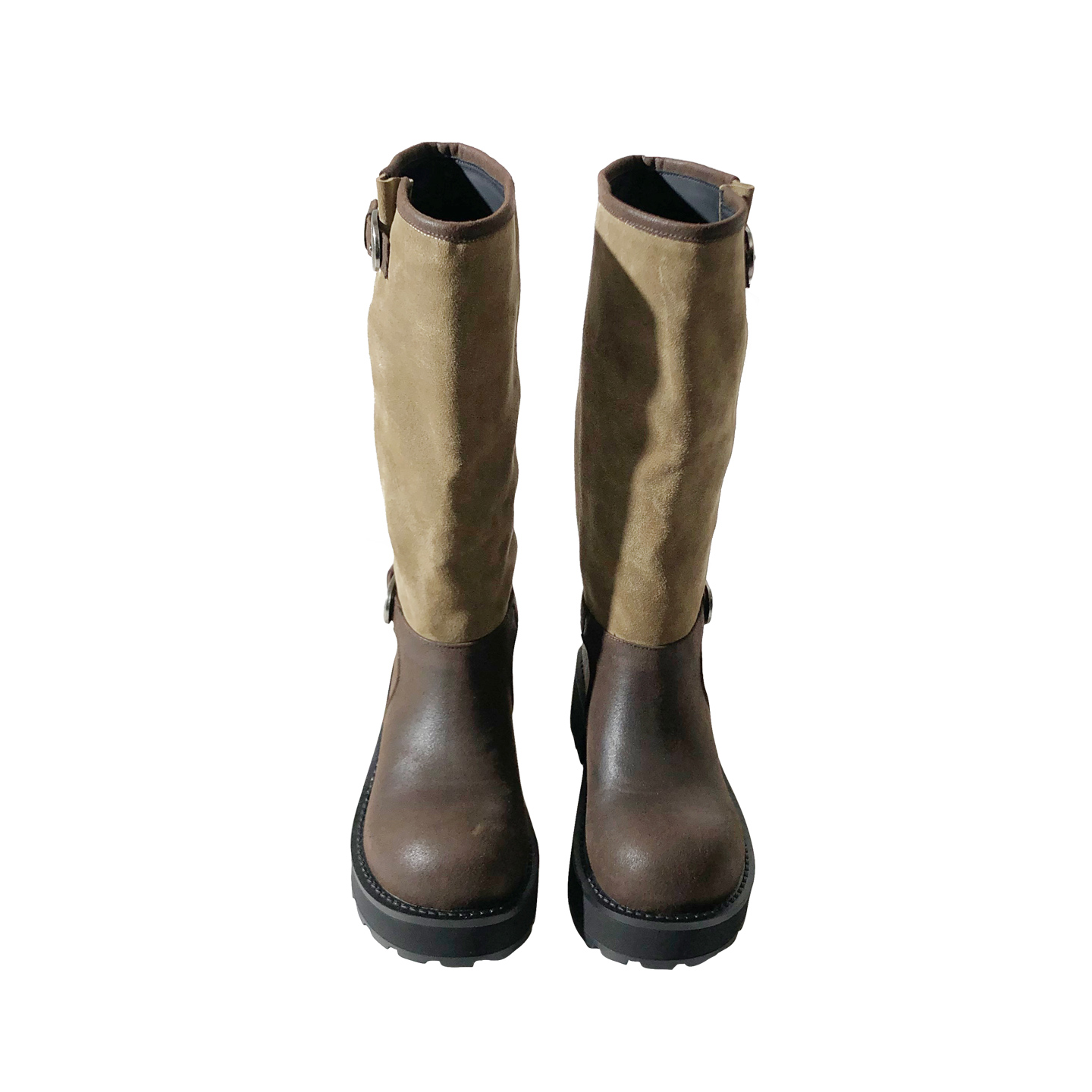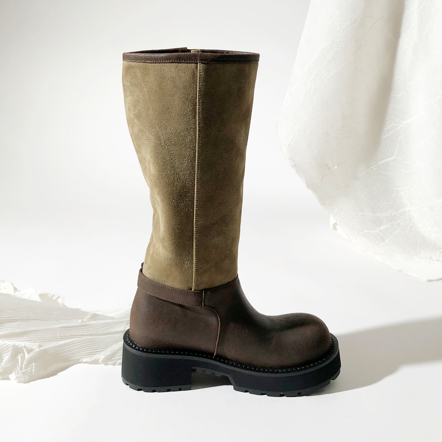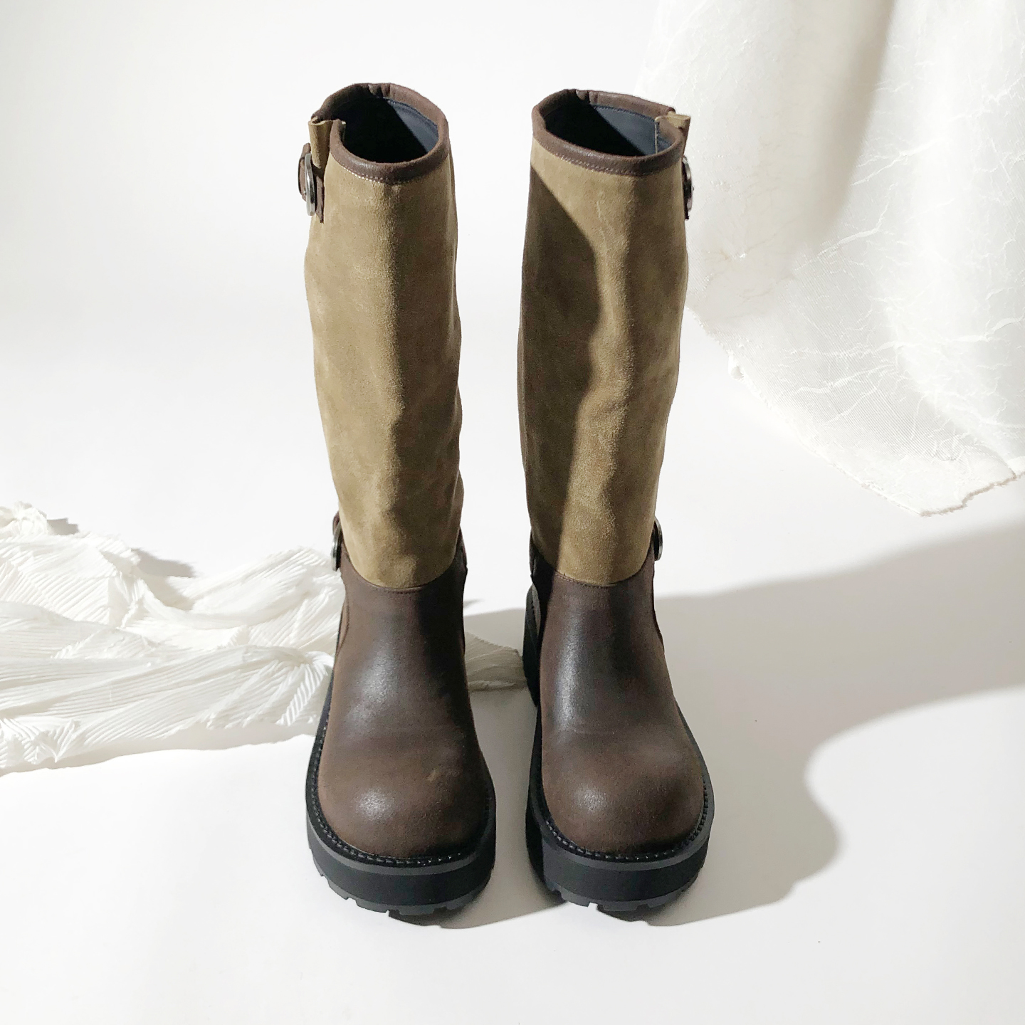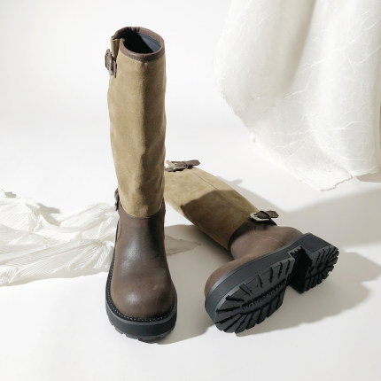 莲花府邸2025秋冬欧美骑士靴时尚高筒拼色女靴子休闲百搭粗跟长靴