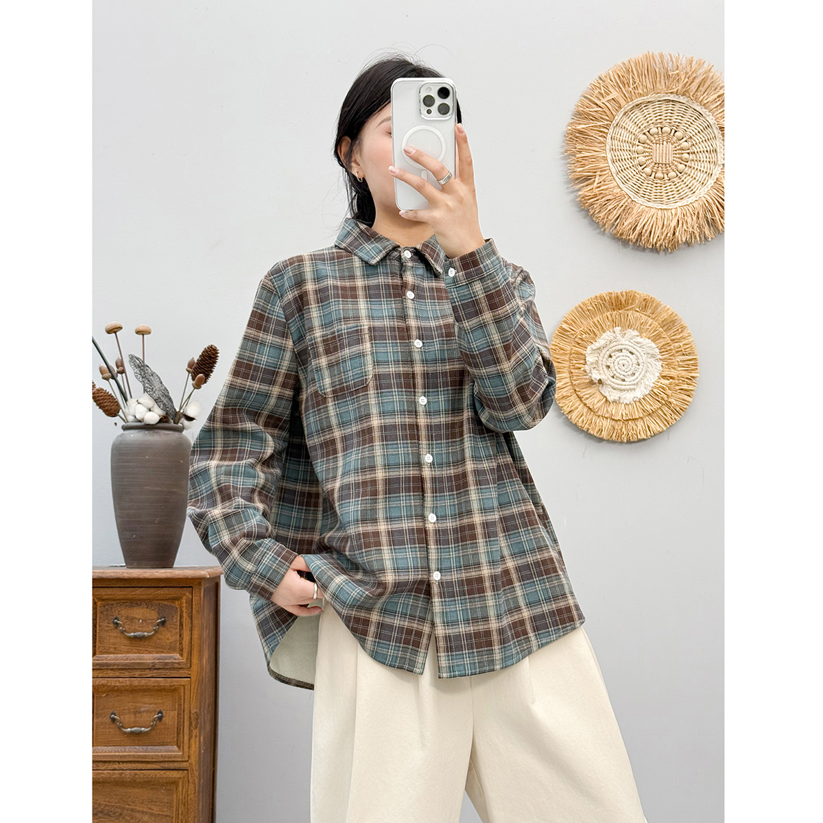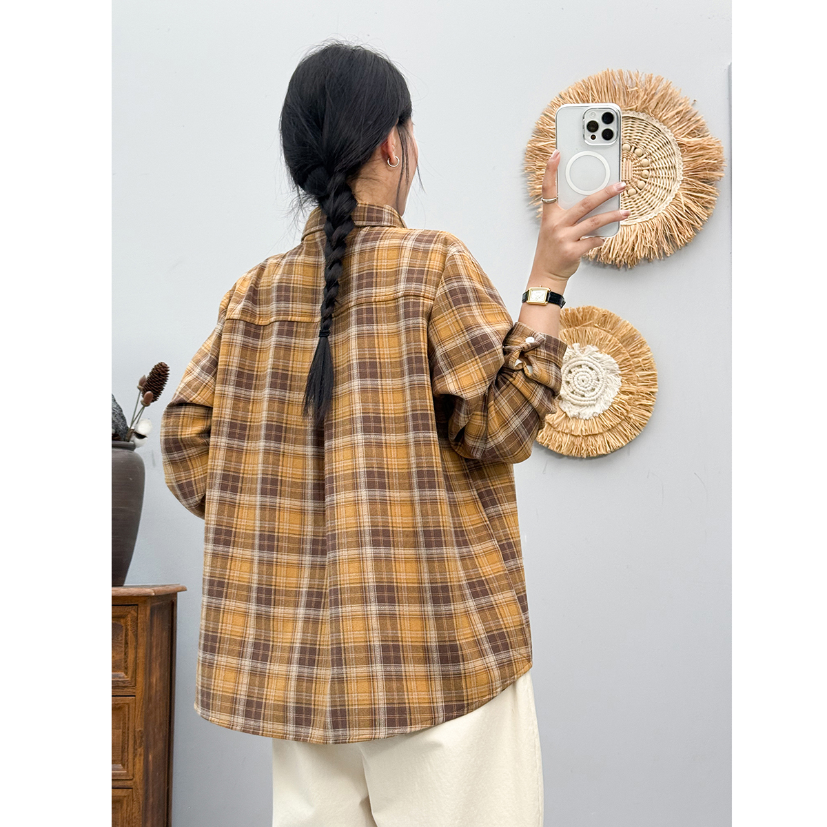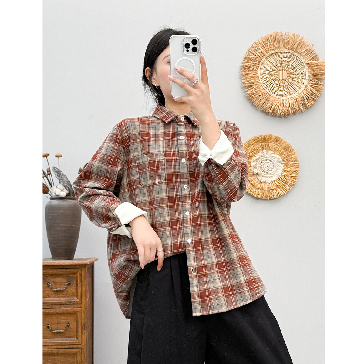 秋冬新款复古加厚加绒格子长袖衬衫女宽松方领休闲纯棉衬衣外套女