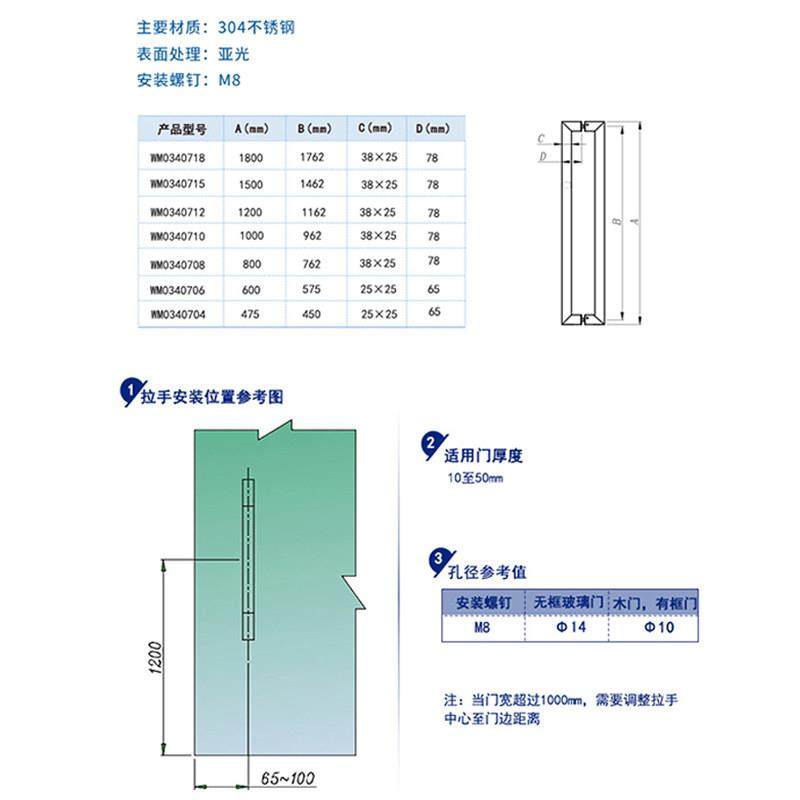 坚朗304不锈钢方管形大门现代KTV木门玻璃门有无框大拉手WM03407