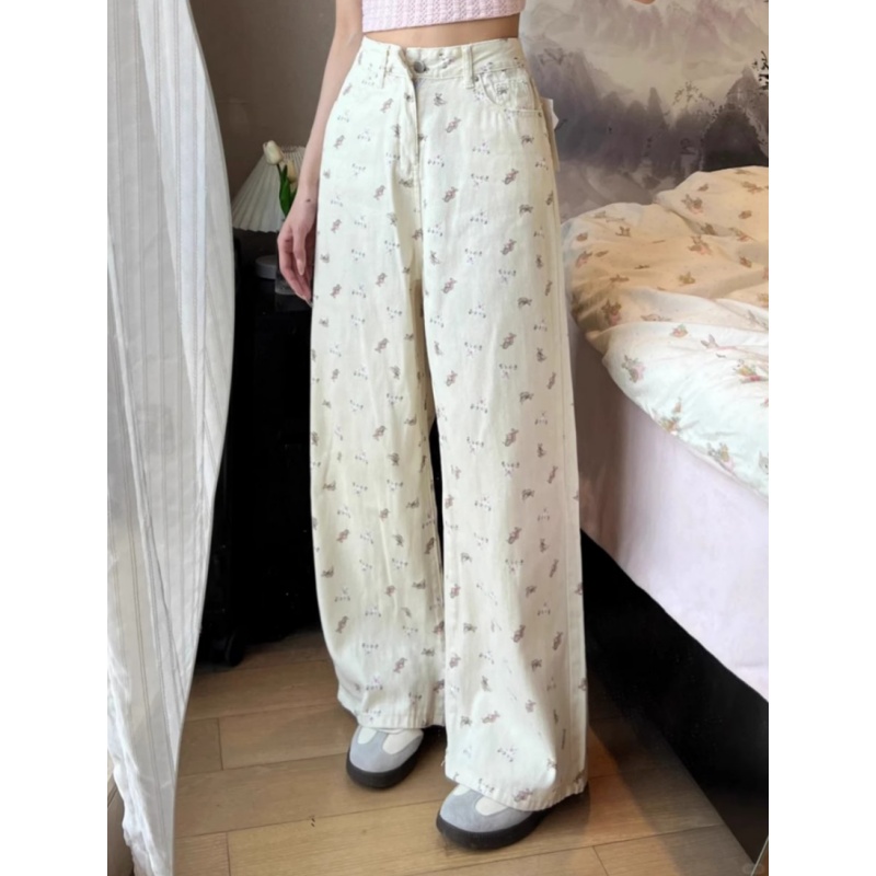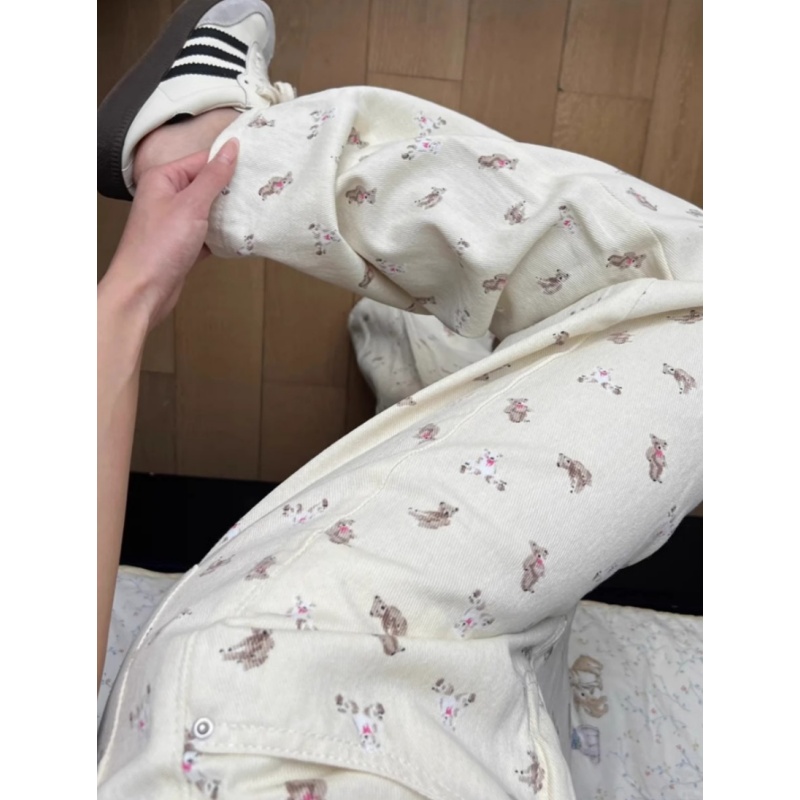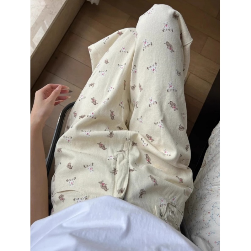 小个子一米五复古简约小熊印花阔腿新款直筒牛仔女裤拖地宽松裤子