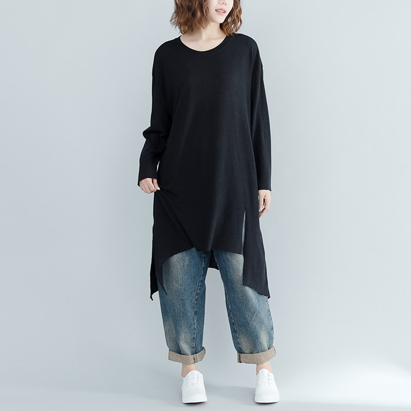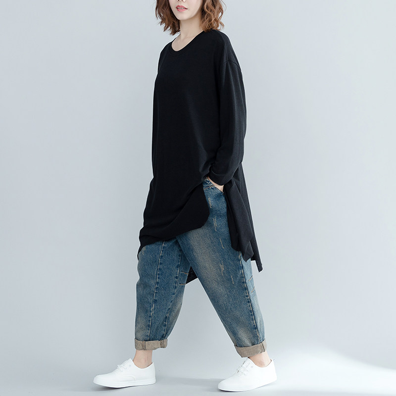 秋季新款韩版大码宽松长袖打底衫中长款不规则下摆开叉T恤女上衣