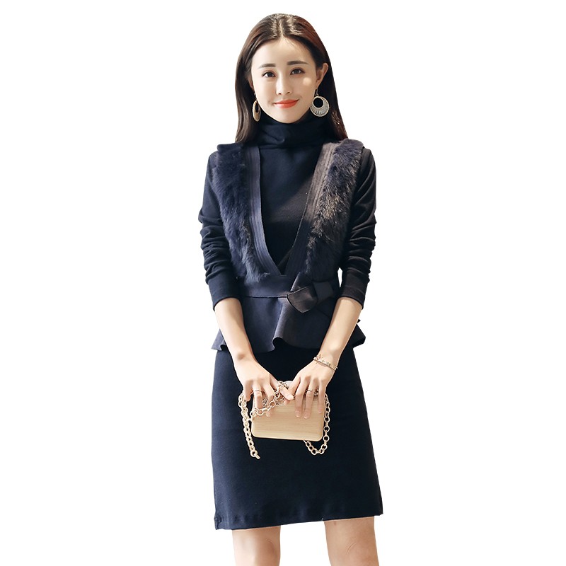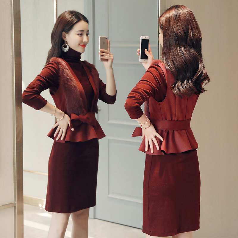 兔毛马甲拼接连衣裙两件套装春秋三季可穿收腰显瘦新中式国风高端
