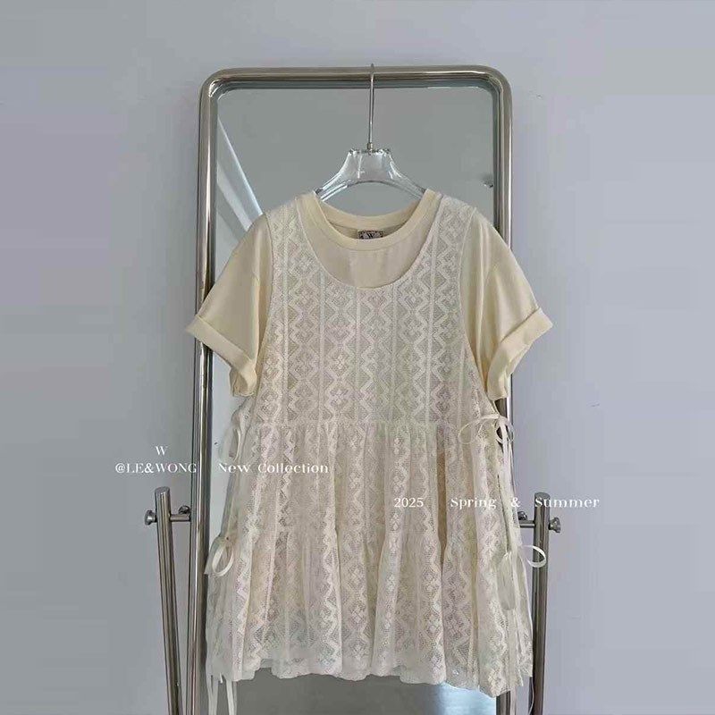 加肥女圆领短袖T恤衫衫蕾丝花朵B背心胖妹妹韩版夏季款休闲两件套