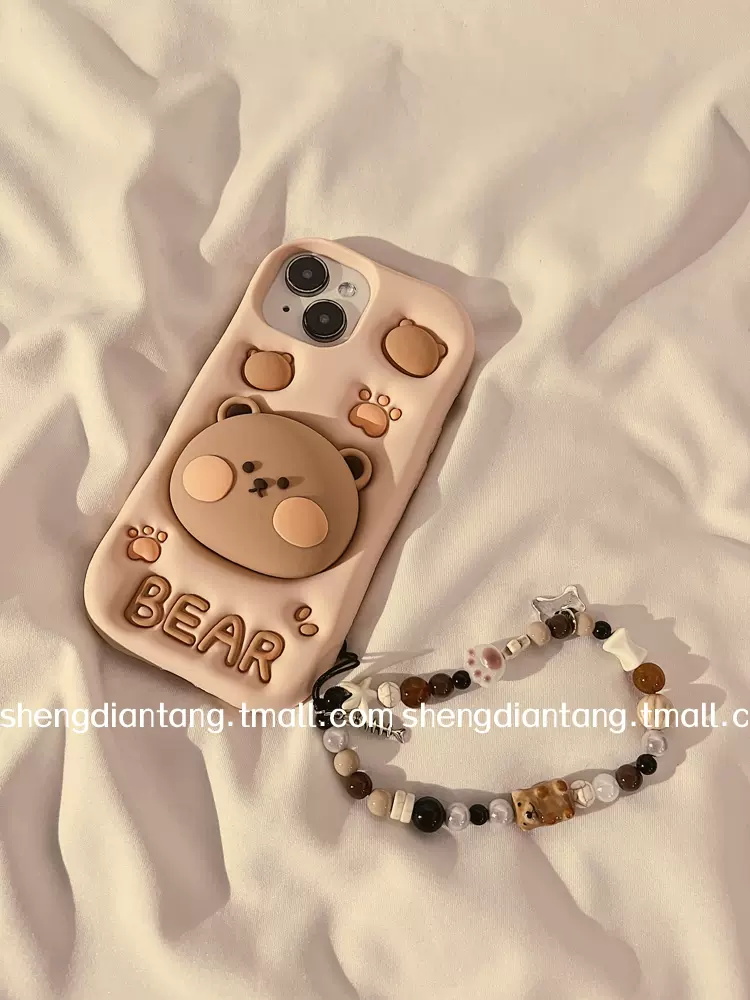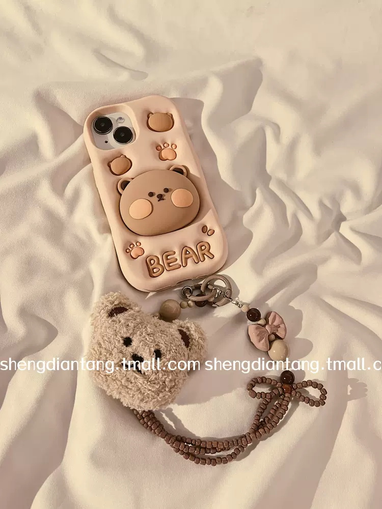 日韩奶茶棕色小熊支架适用iPhone16promax手机壳苹果17可爱15立体14plus软硅胶套13手链12mini全包11女xs新款
