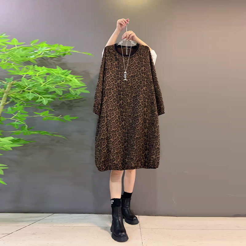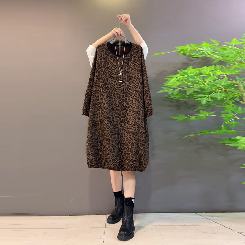 胖MM圆领长袖豹纹连衣裙宽松遮肚子大码女装欧洲站中长款显瘦裙子