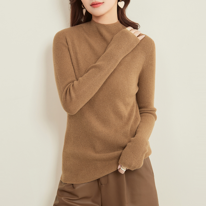 金菊羊毛羊绒打底衫秋冬新款半高领纯色细坑条保暖套头女式羊毛衫