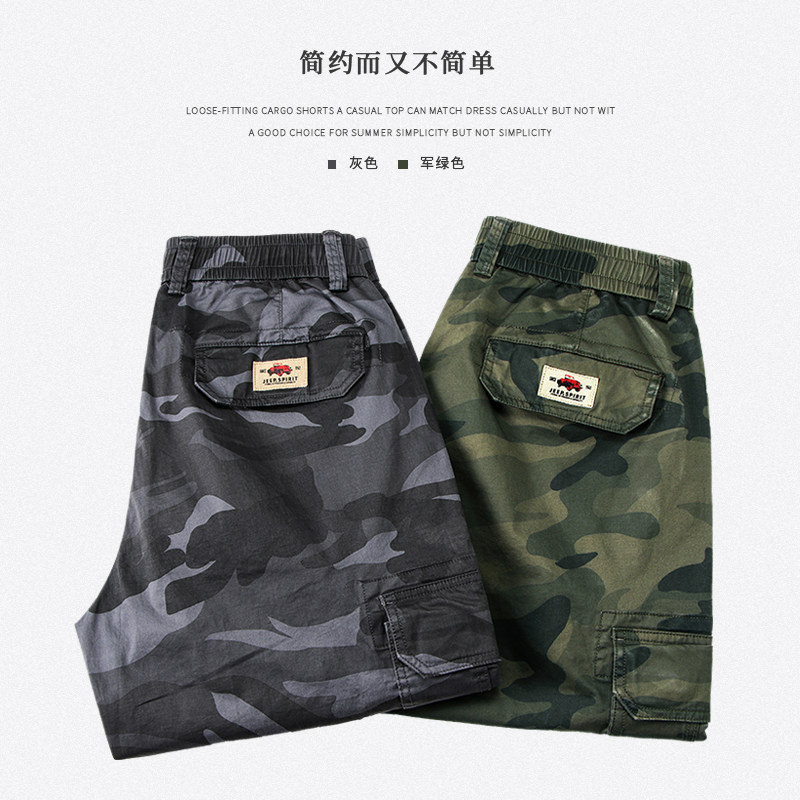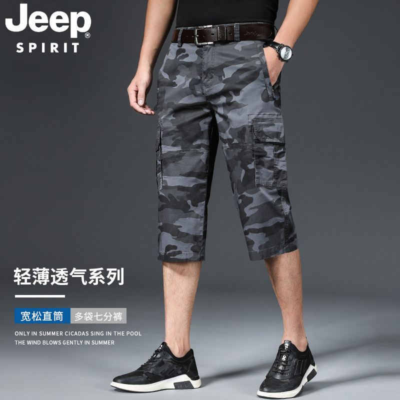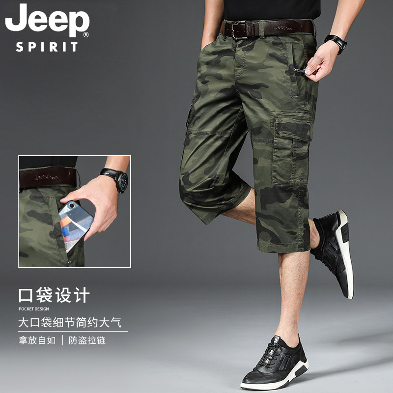 吉普七分工装裤子男士宽松直筒户外迷彩松紧腰多口袋休闲短裤