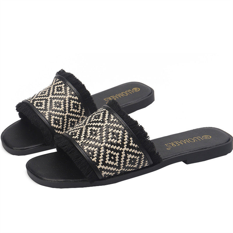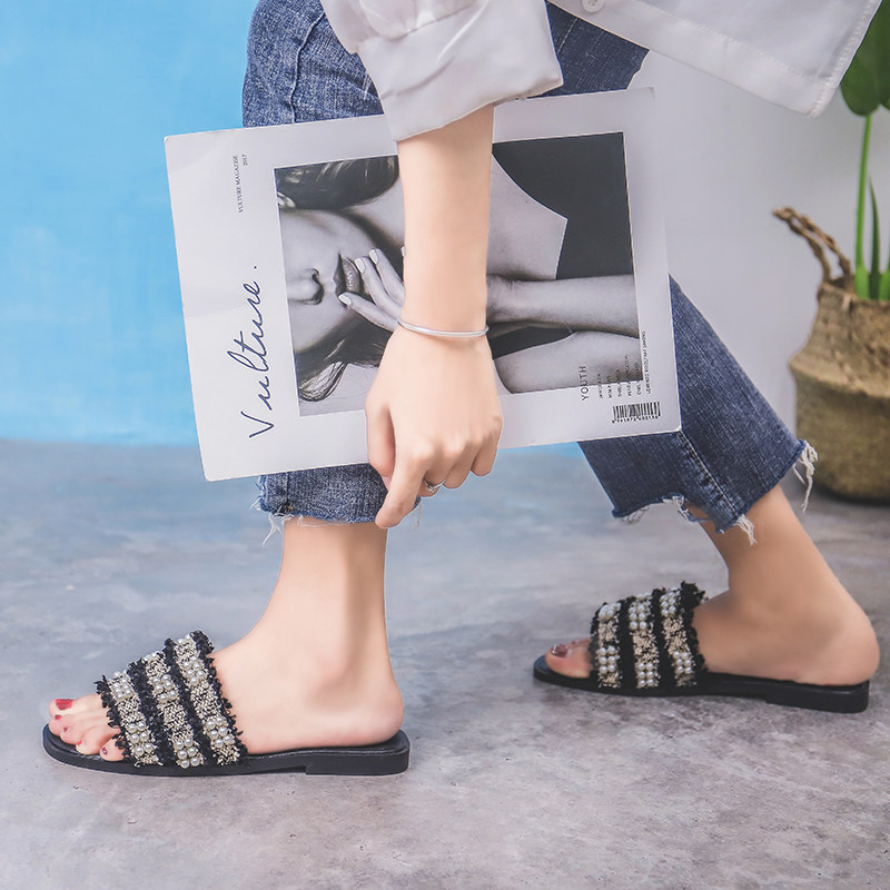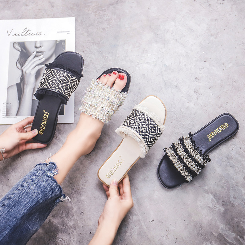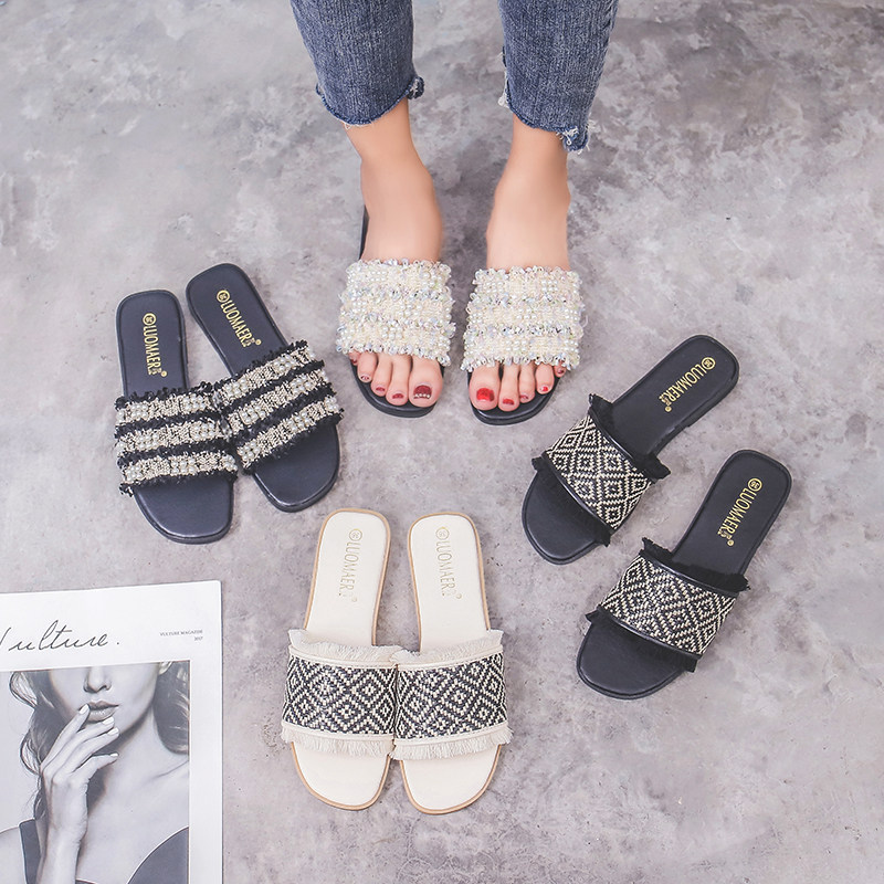度假凉拖鞋女夏季时尚外穿珍珠流苏C孕妇胖脚宽平底大码女鞋41一4