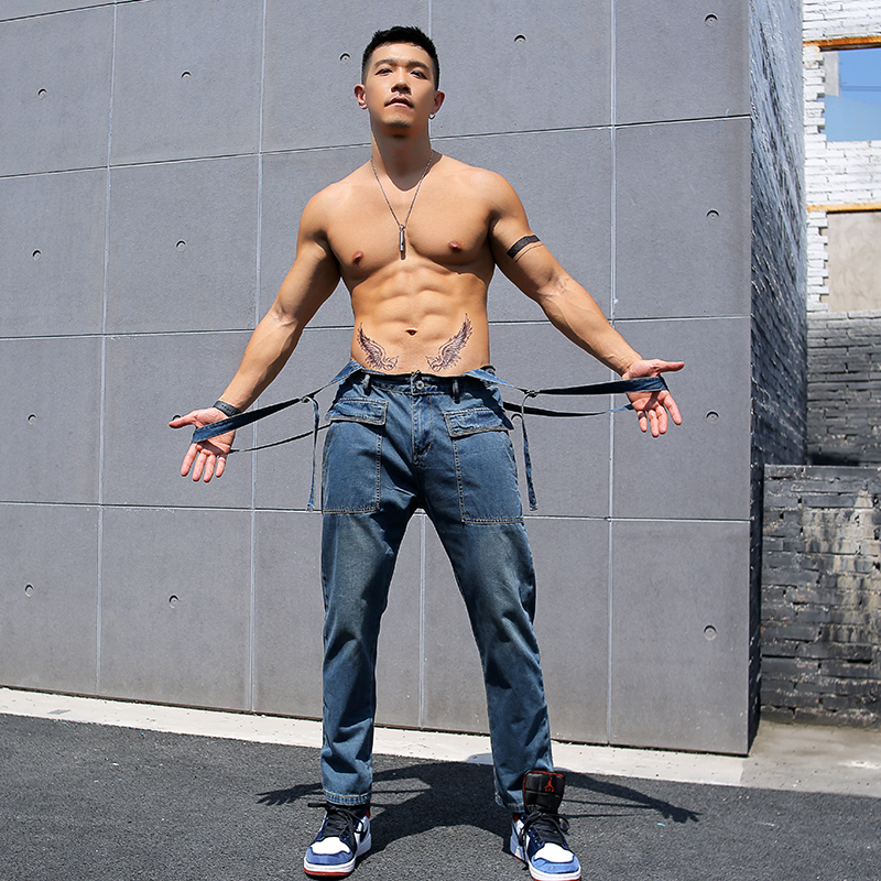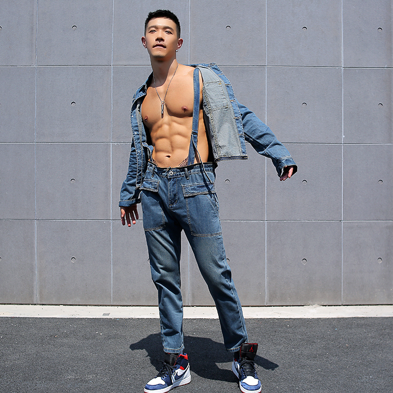 辉先生冬季男士牛仔裤连体衣可拆卸背带裤牛仔外套套装小脚修身潮
