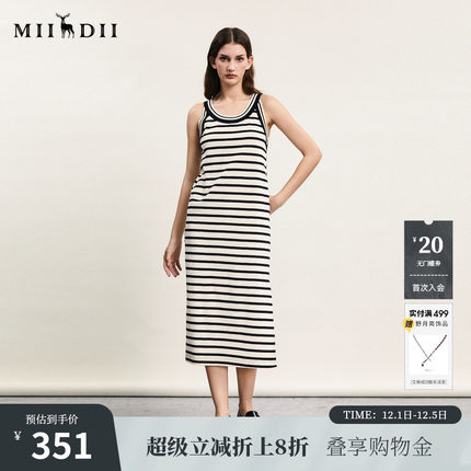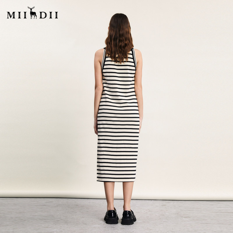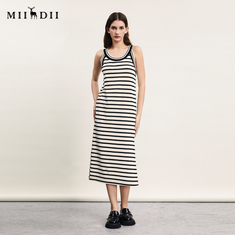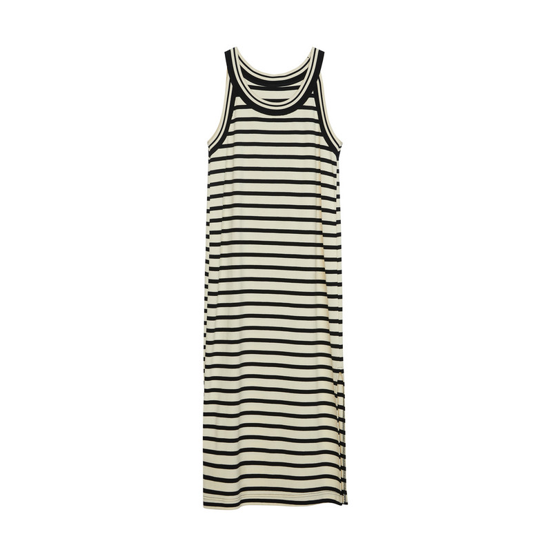 谜底连衣裙无袖女春新款文艺风条纹亲肤修身中长裙241ML0117
