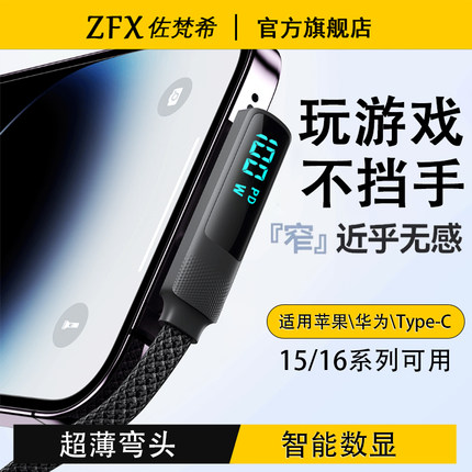 超薄弯头不挡手100W数显双typec快充数据线适用苹果iPhone16华为OPPO小米15手机PD27W电竞游戏编织扁线充电线
