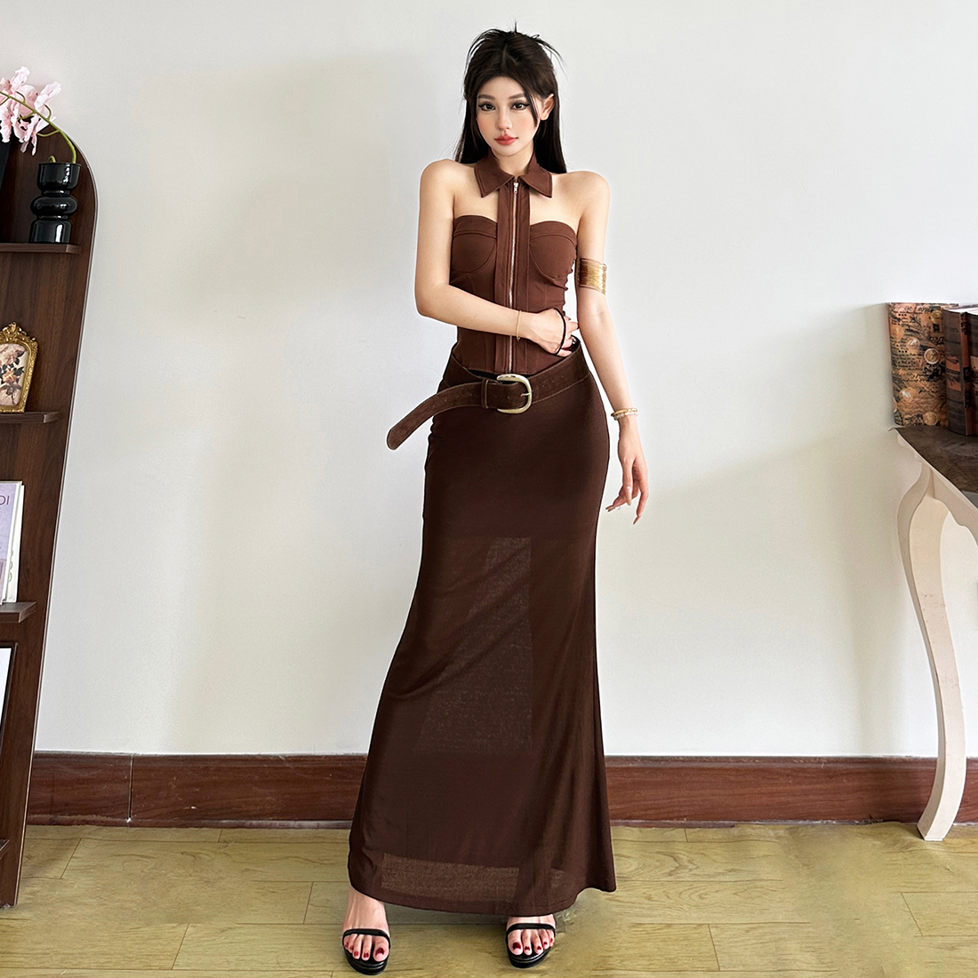 #Sisjuly#优雅美拉德拉链polo领露背挂脖背心 轻纱微透长裙套装女