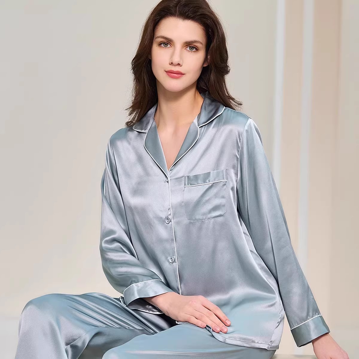 丝界真丝睡衣纯色长袖100%桑蚕丝