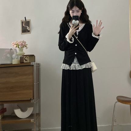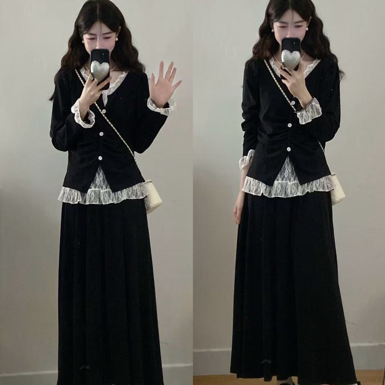 秋季新款韩版洋气蕾丝拼接上衣半身裙两件套