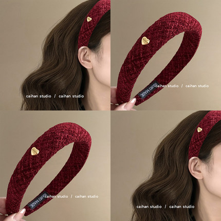馥郁酒红!爱心金标发箍!复古格纹头箍女外出高颅顶发卡旅行发饰