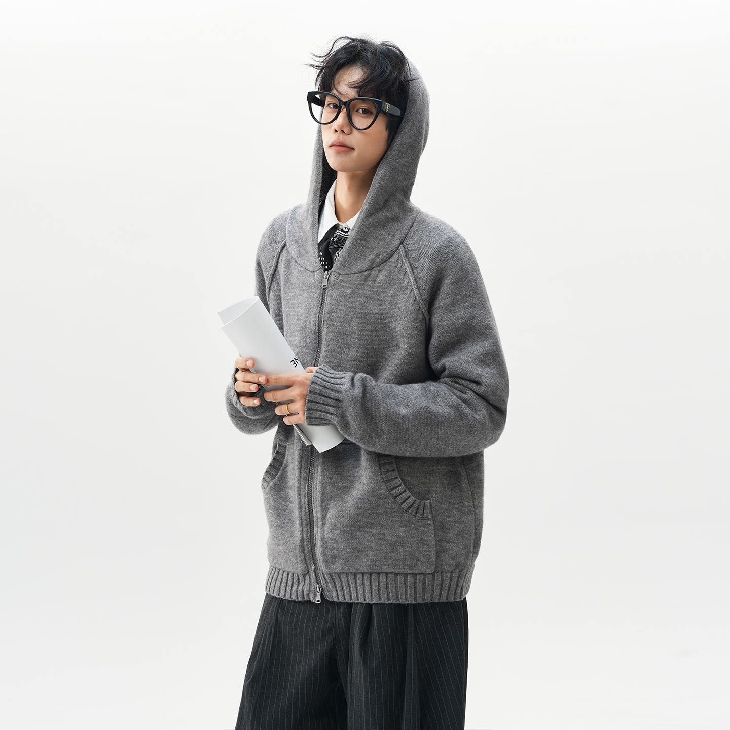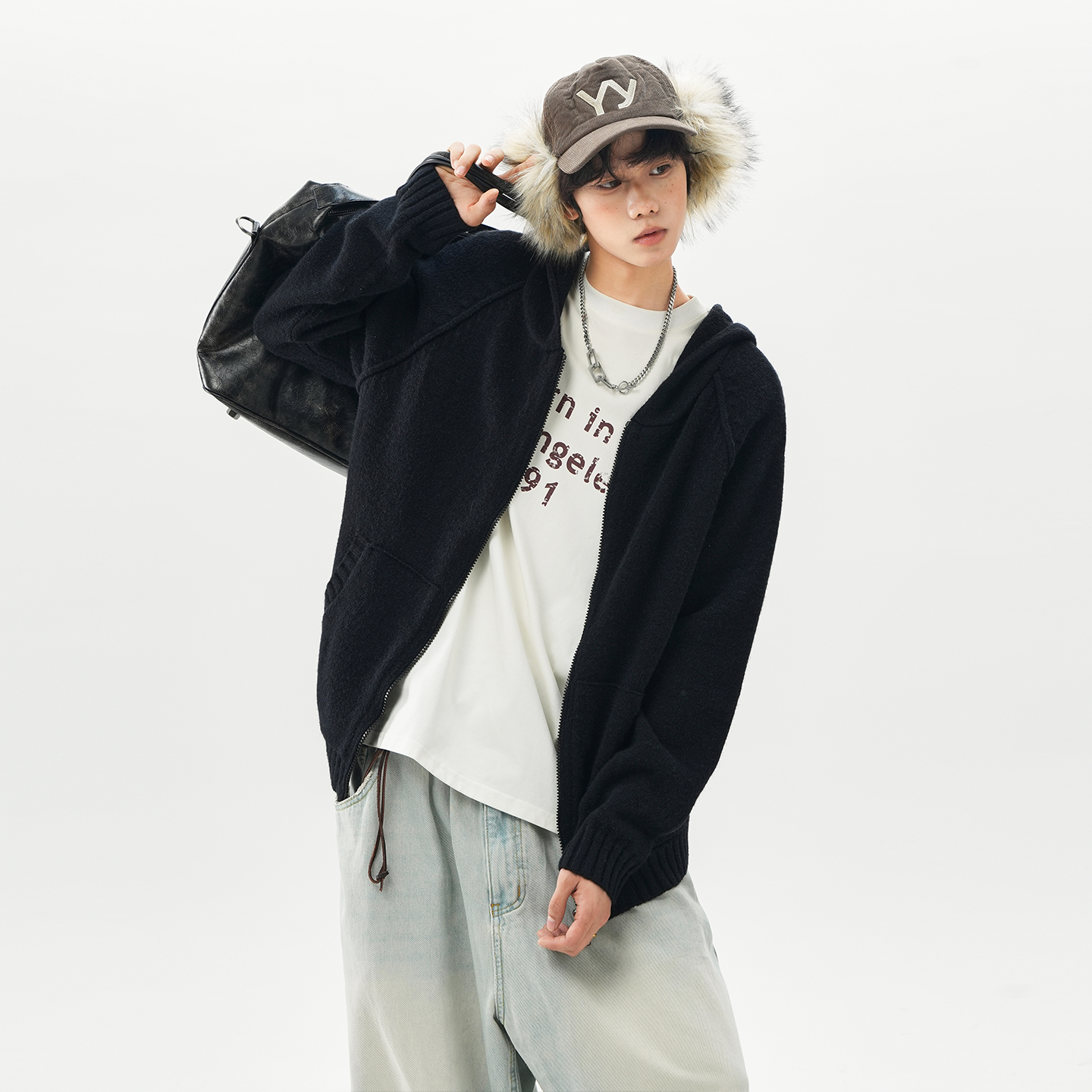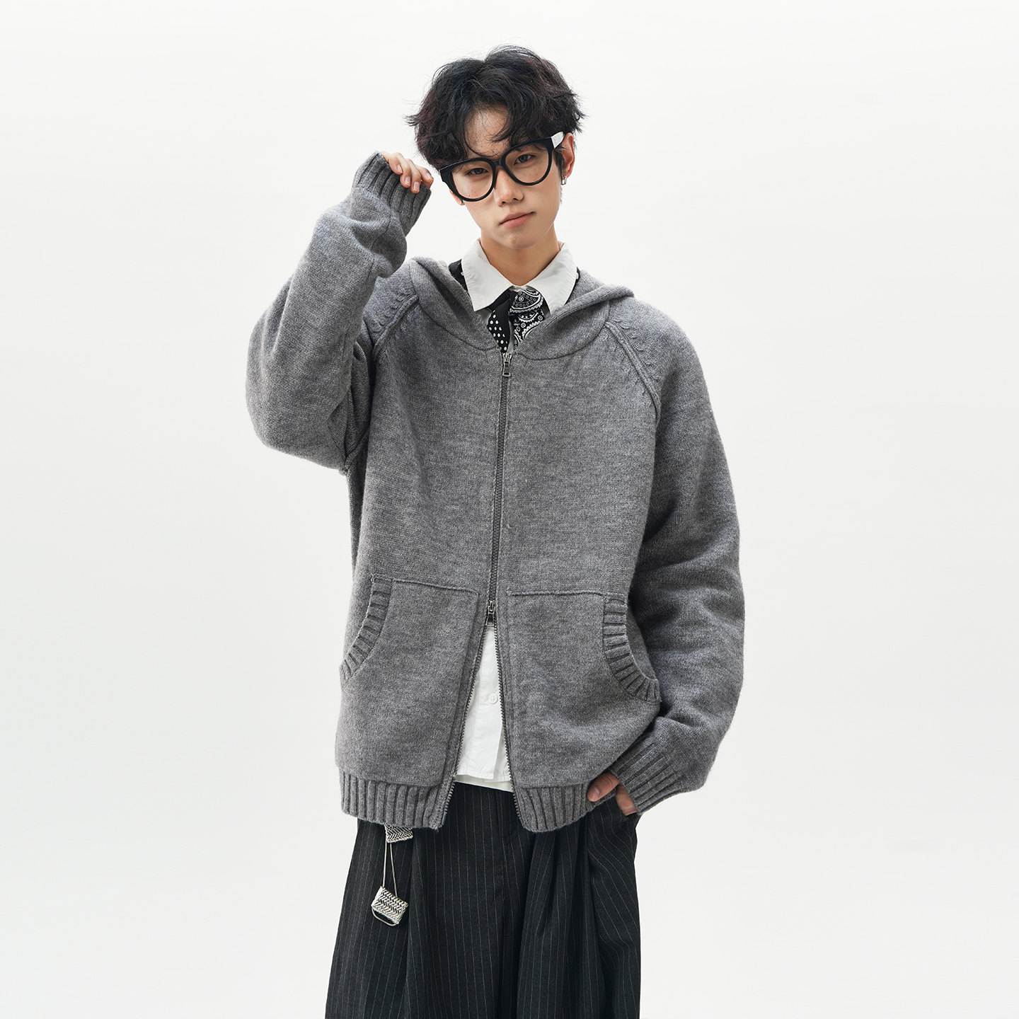 美式高级双拉链拼接开衫连帽毛衣