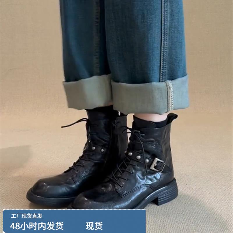 牛皮版~覆古水洗皮侧拉炼真皮马丁靴女一字带铆钉系带粗跟机车靴