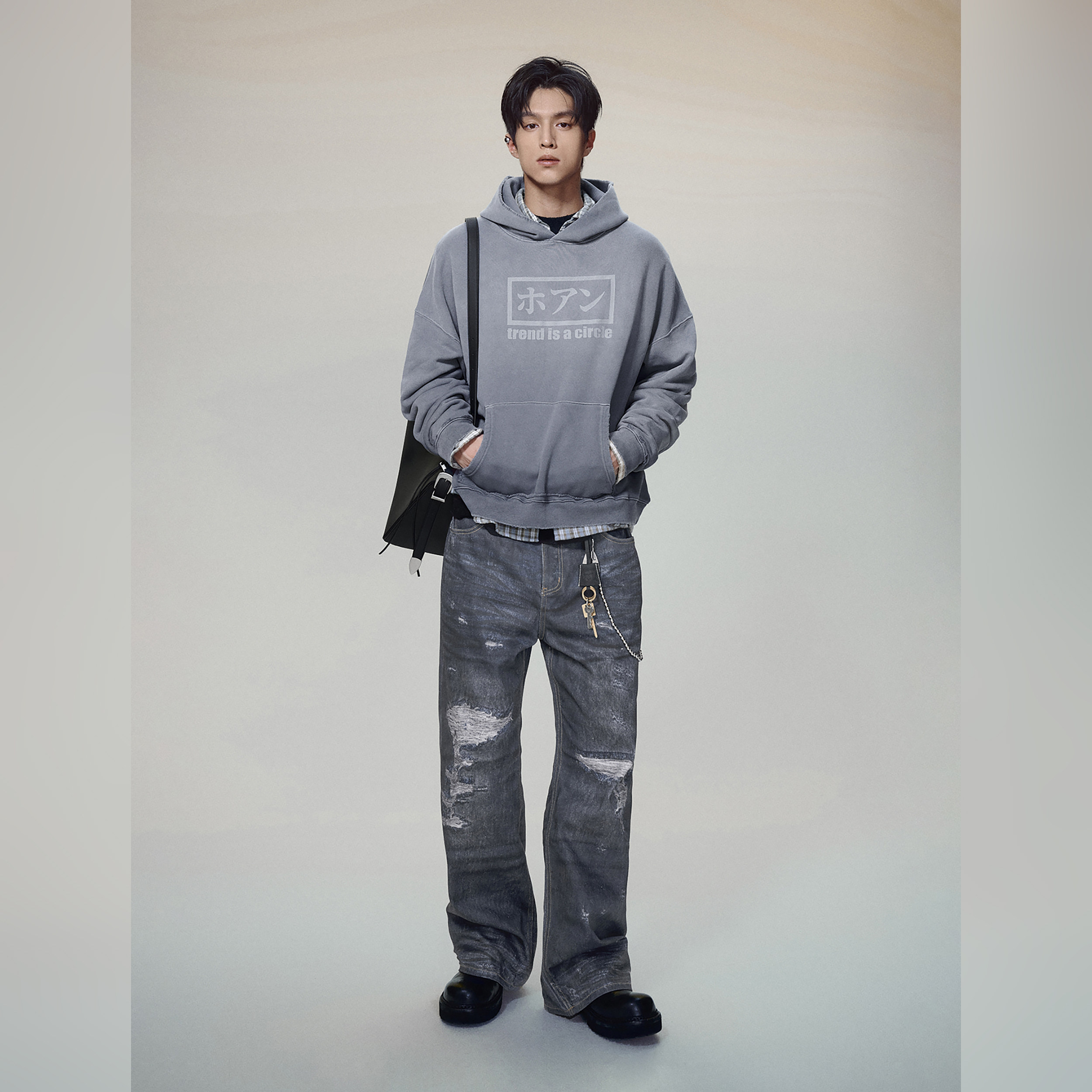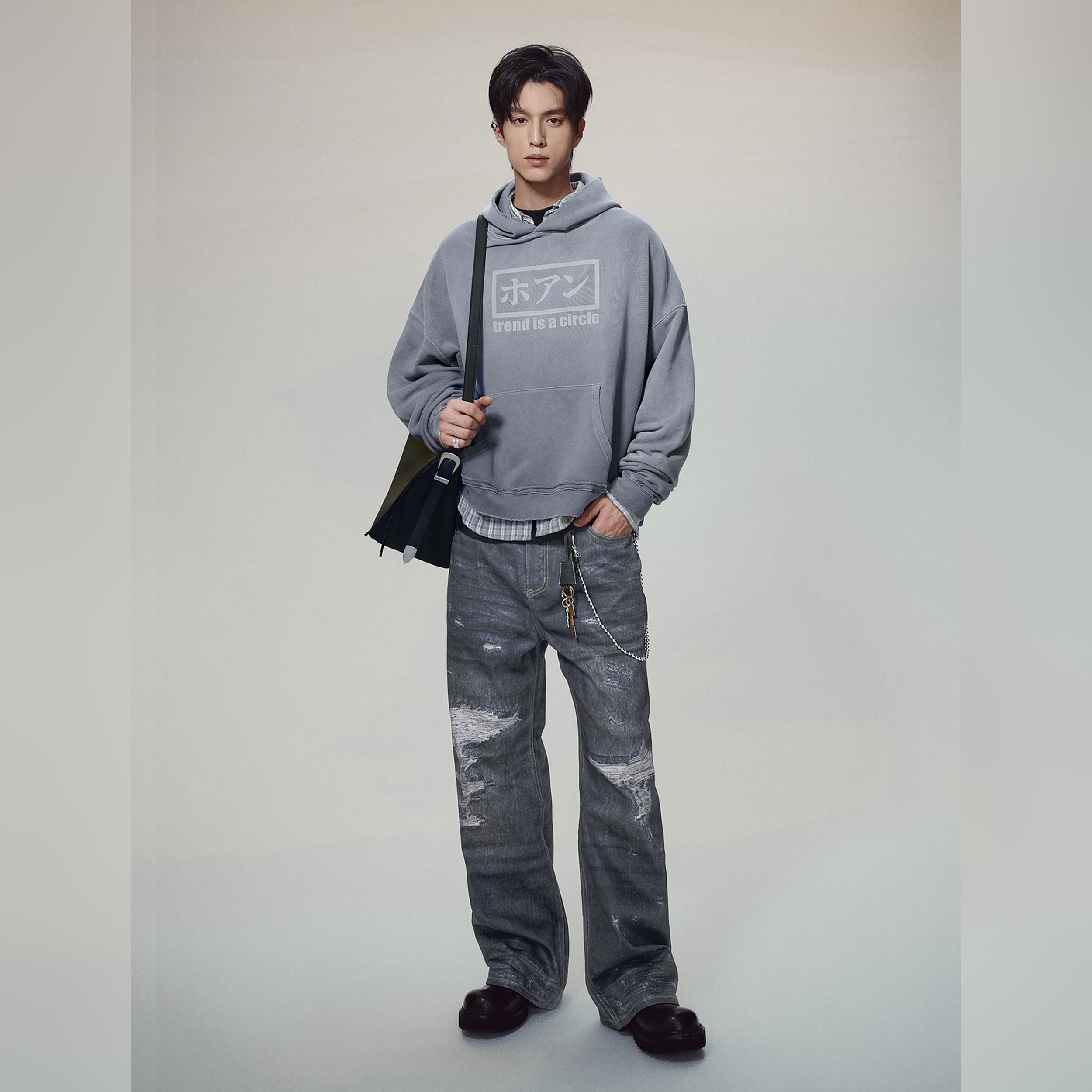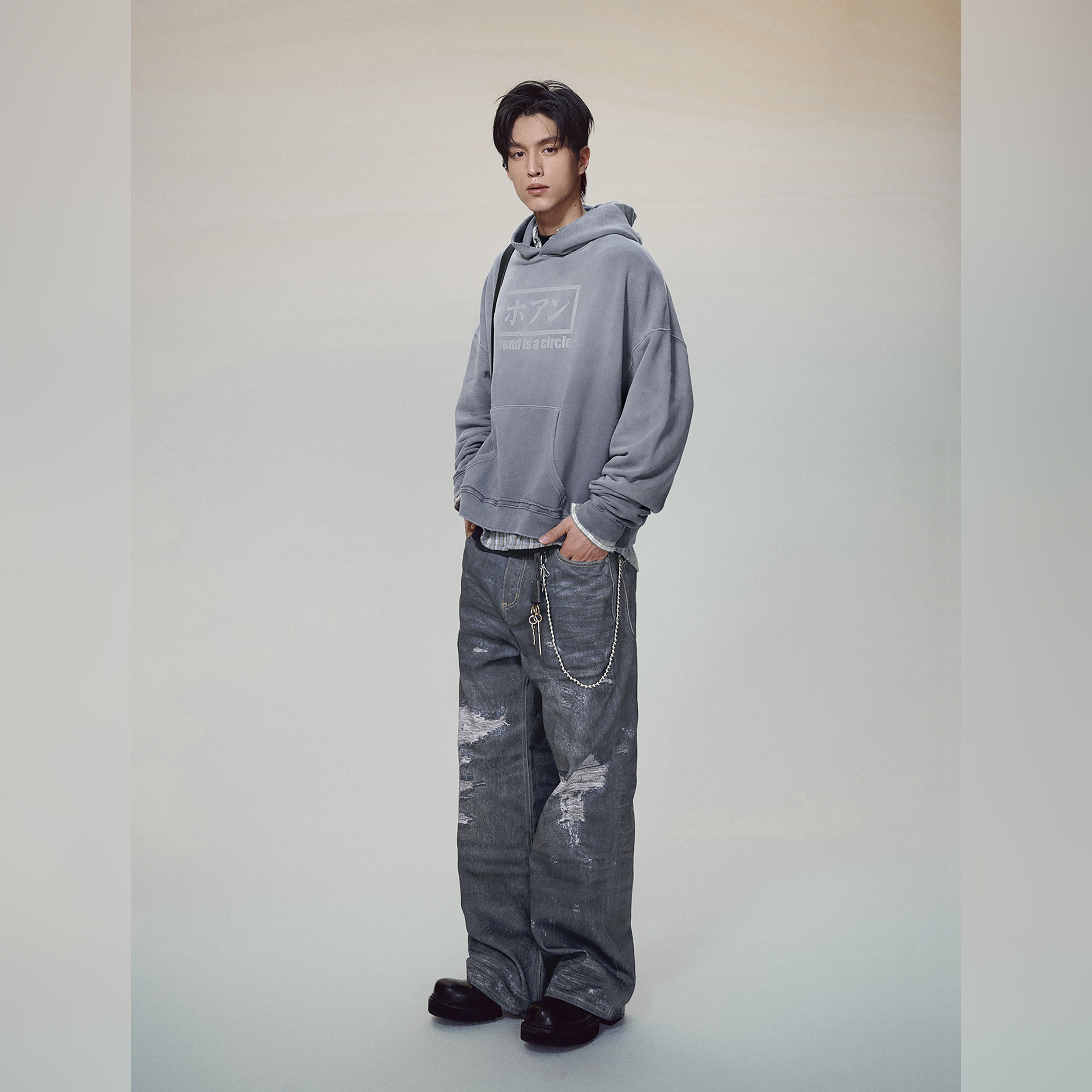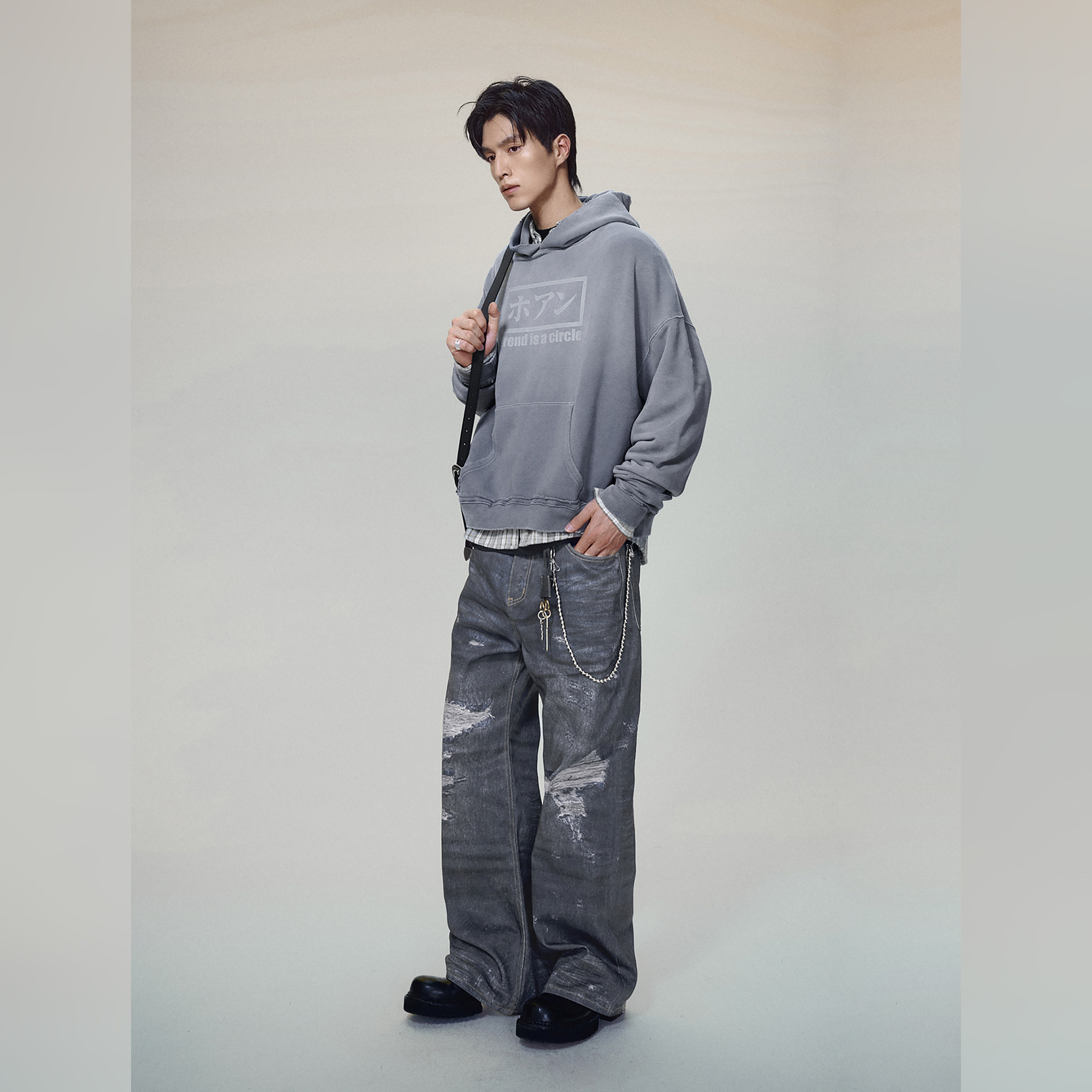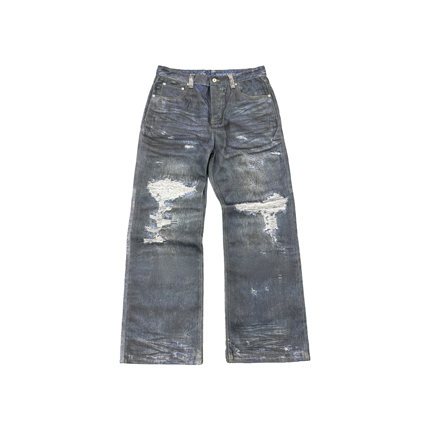 haonanhuang 康利数码印花破坏抹脏水洗复古做旧宽松微喇牛仔长裤