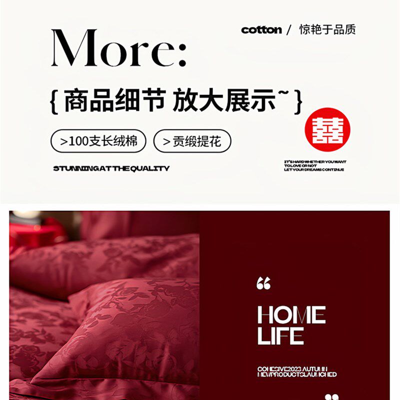 国梦高端100S长m绒棉全棉红色喜被结婚四件套床上用品床单被套4