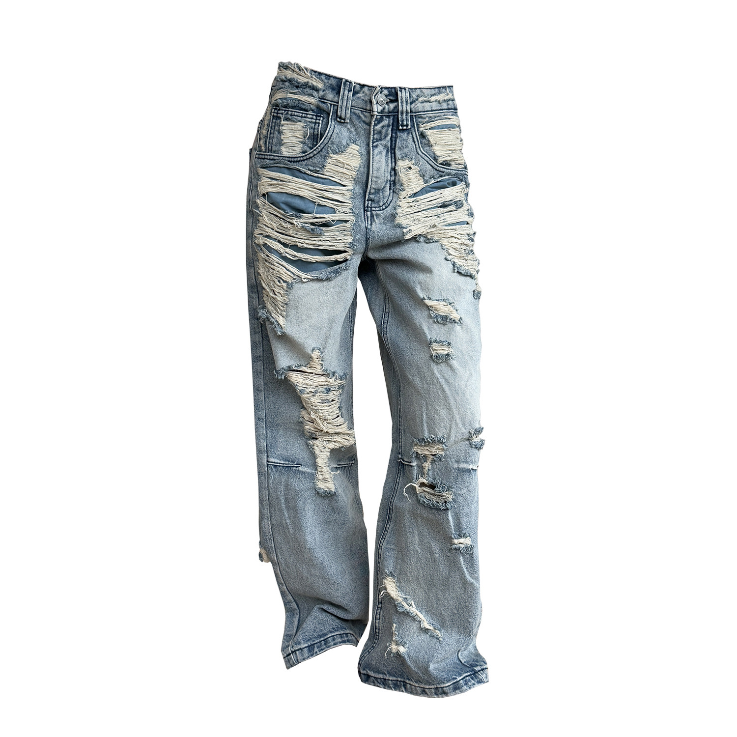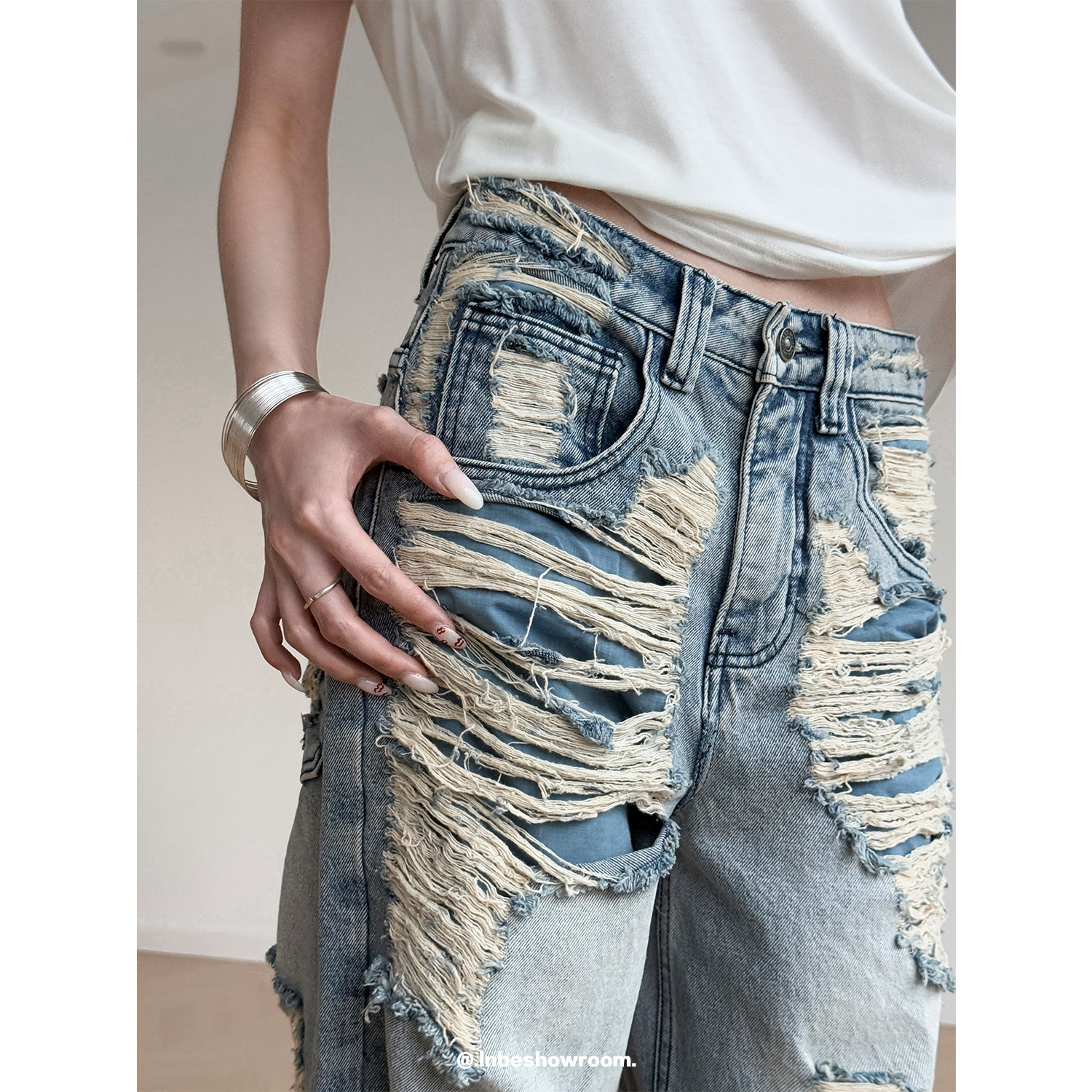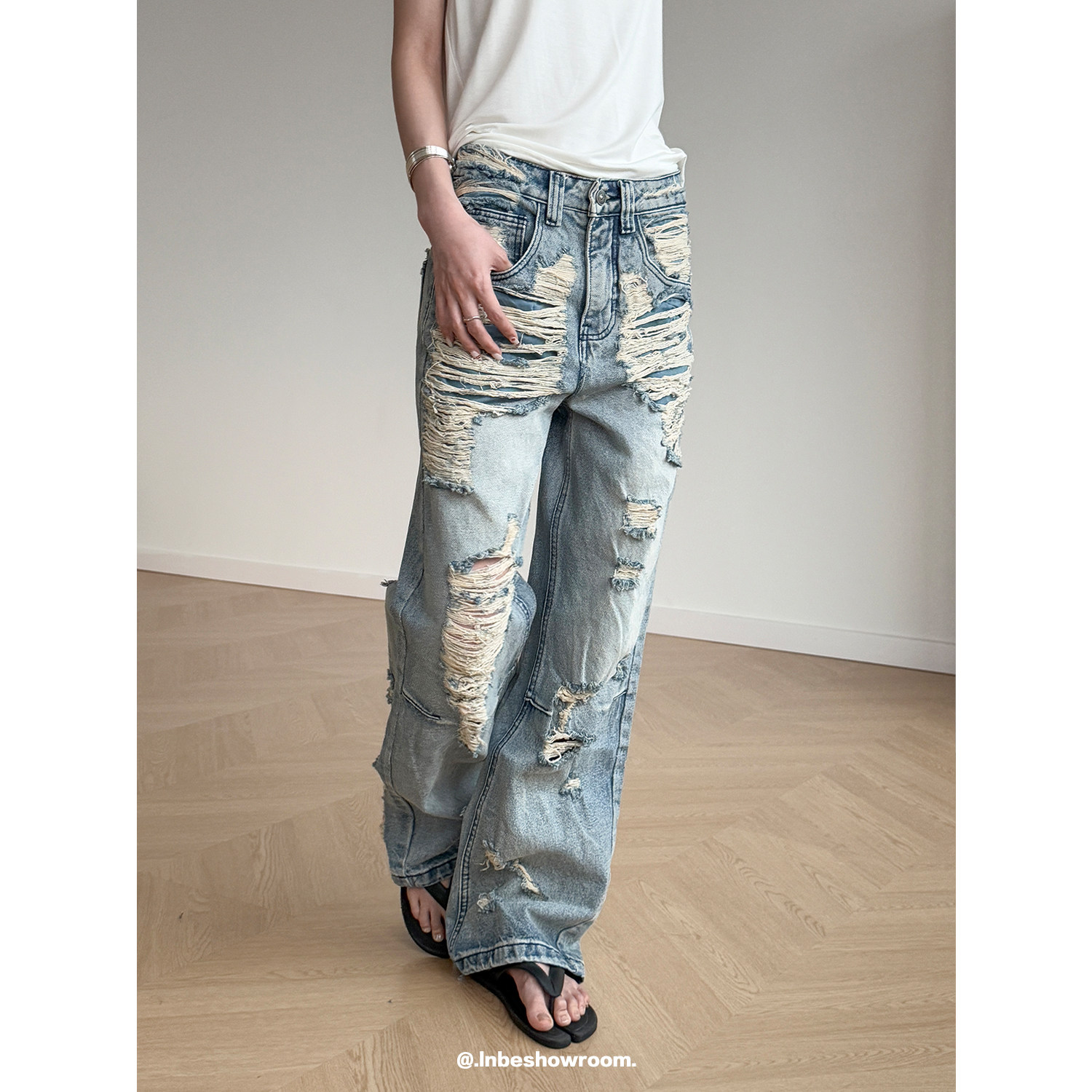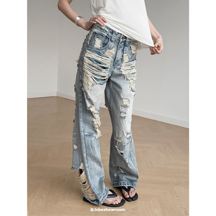 Inbeshowroom设计感美式水洗做旧破洞牛仔裤女宽松直筒阔腿长裤子
