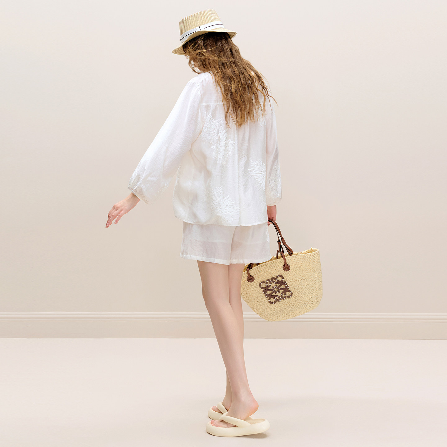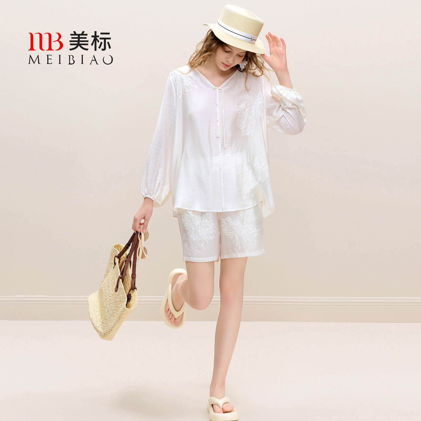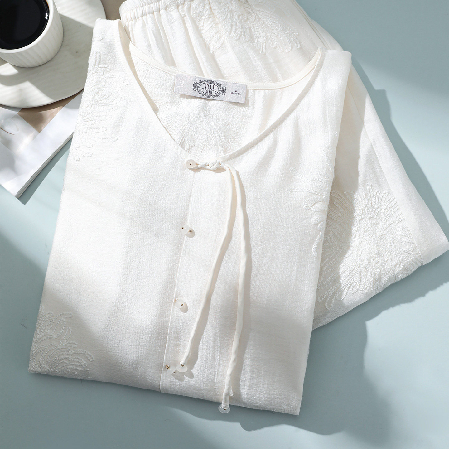 美标新品新中式中国风刺绣睡衣套装女春夏季薄款亚麻可外穿家居服