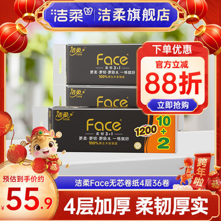 洁柔纸巾Face卷纸卫生纸无芯卷筒纸厕纸4层100g共36卷实惠家庭装