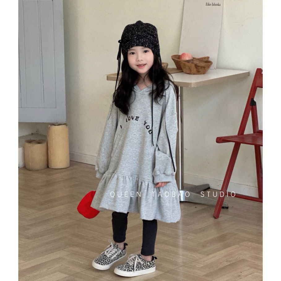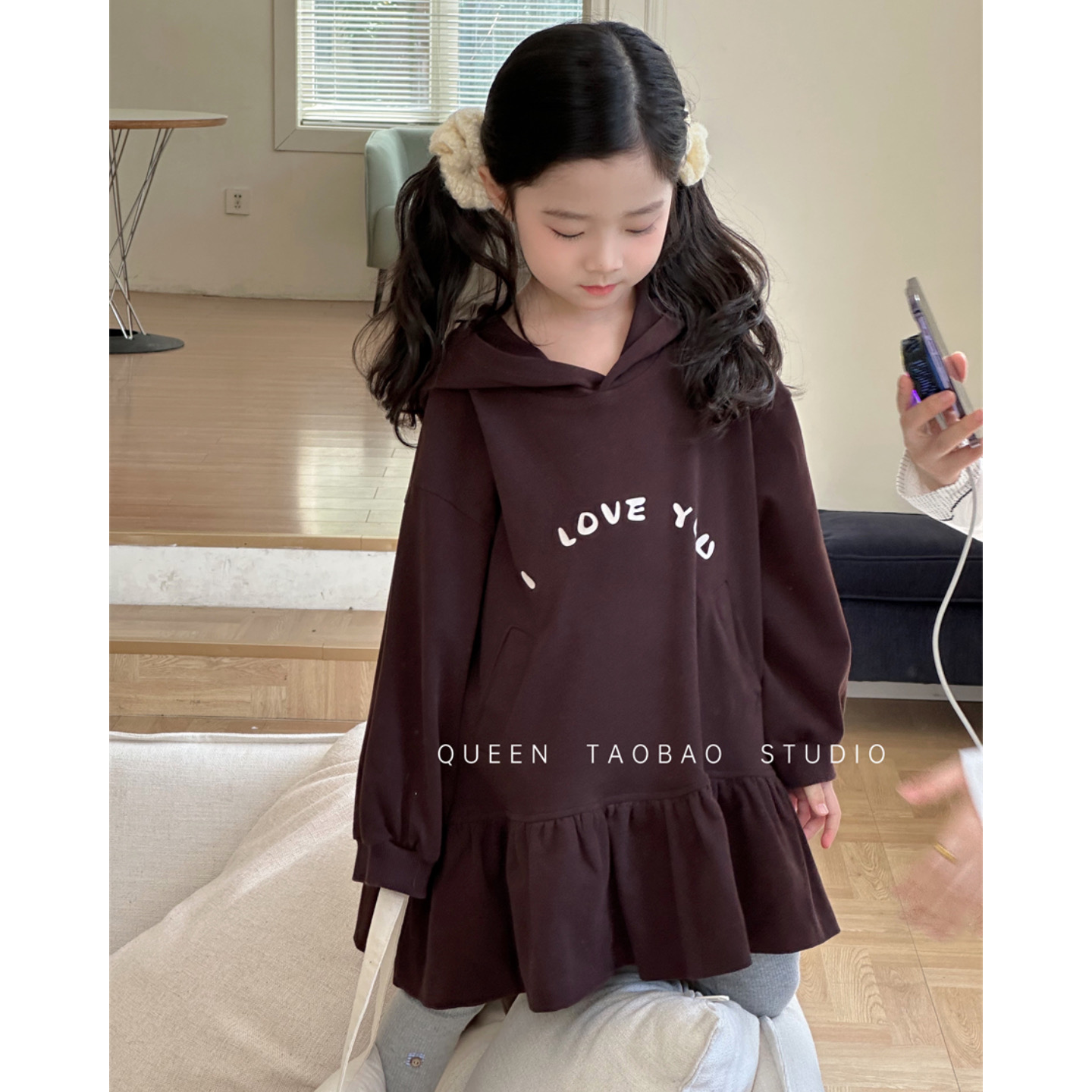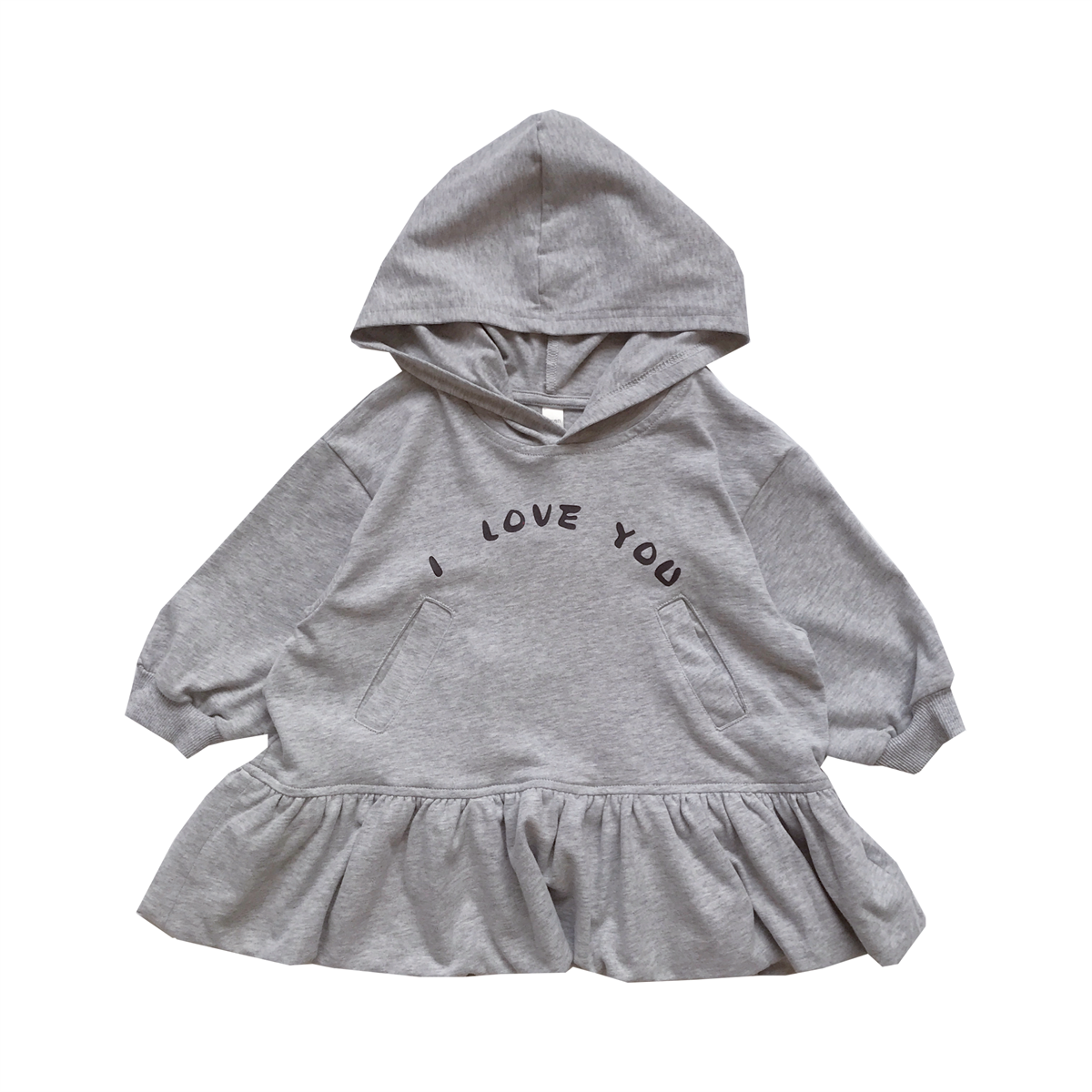 韩国女童字母印花连帽卫衣裙春秋新品宝宝洋气荷叶片灯笼袖连衣裙
