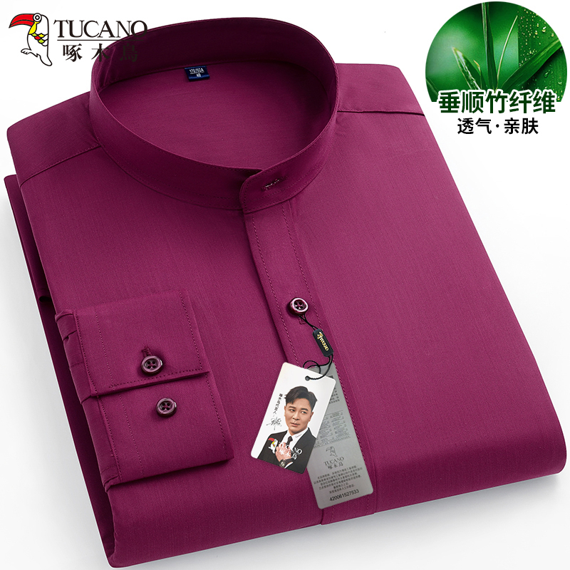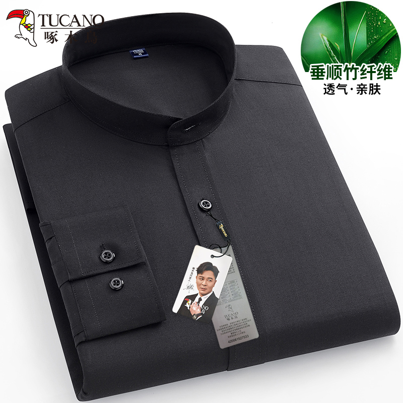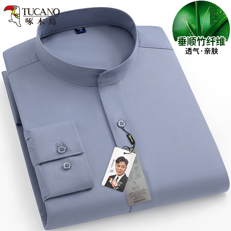 啄木鸟新款国风男士长袖竹纤维立领衬衫时尚休闲中式宽松大码衬衣