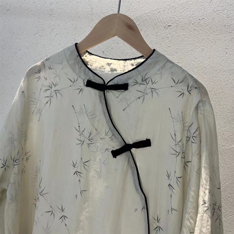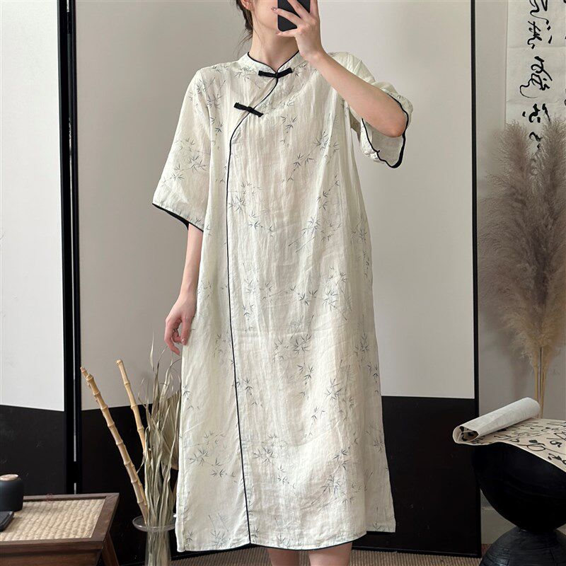 文艺夏季国风小众百搭苎麻中式竹叶印花禅意风改良旗袍连衣裙女