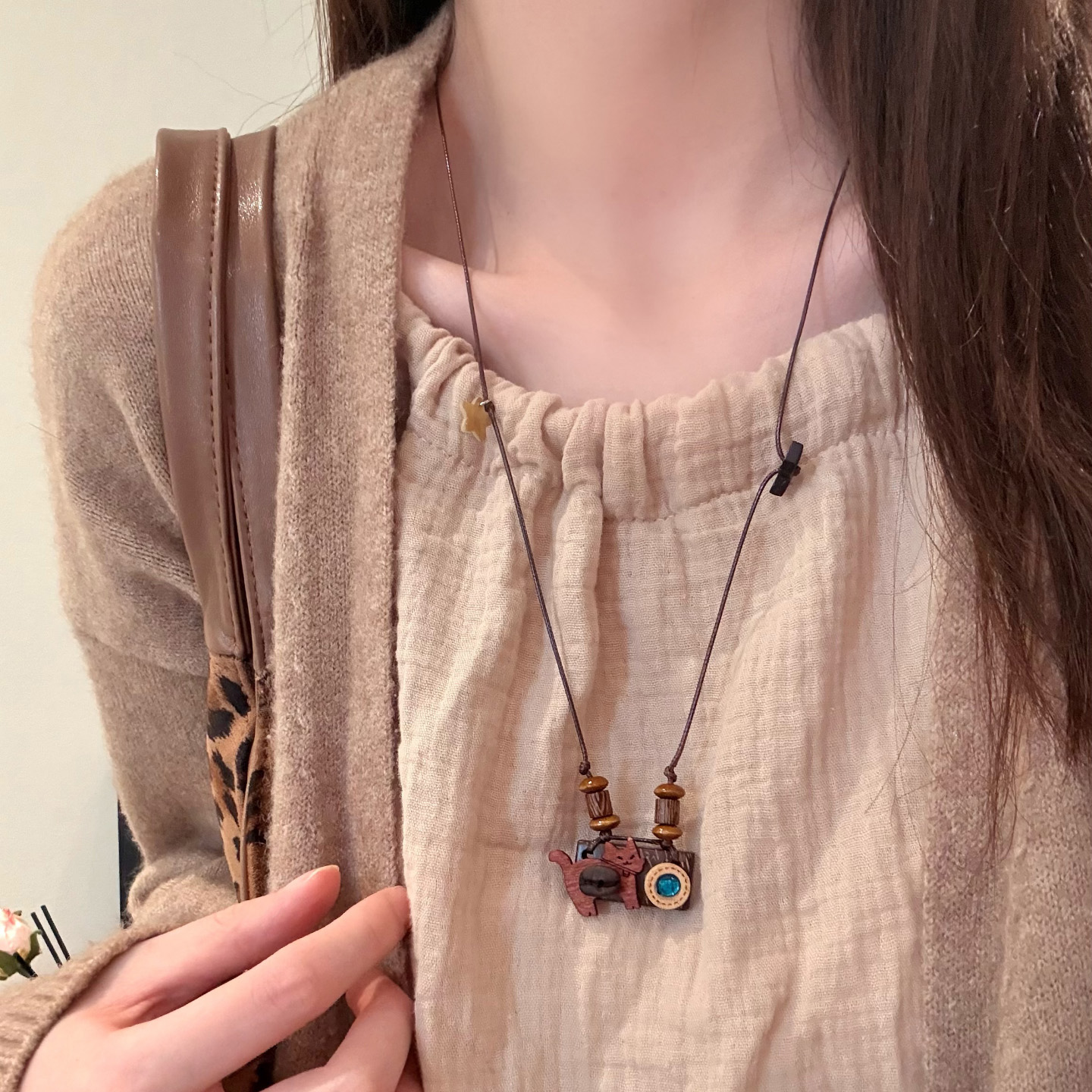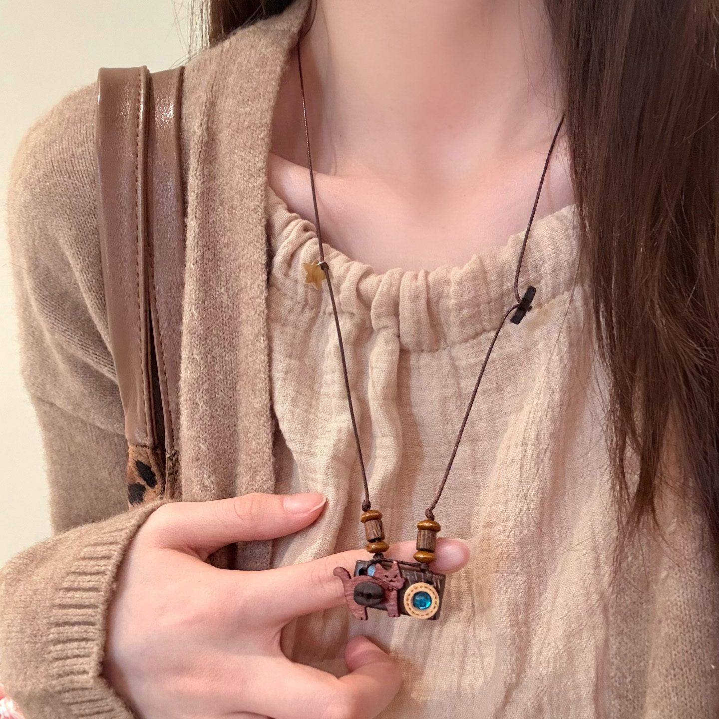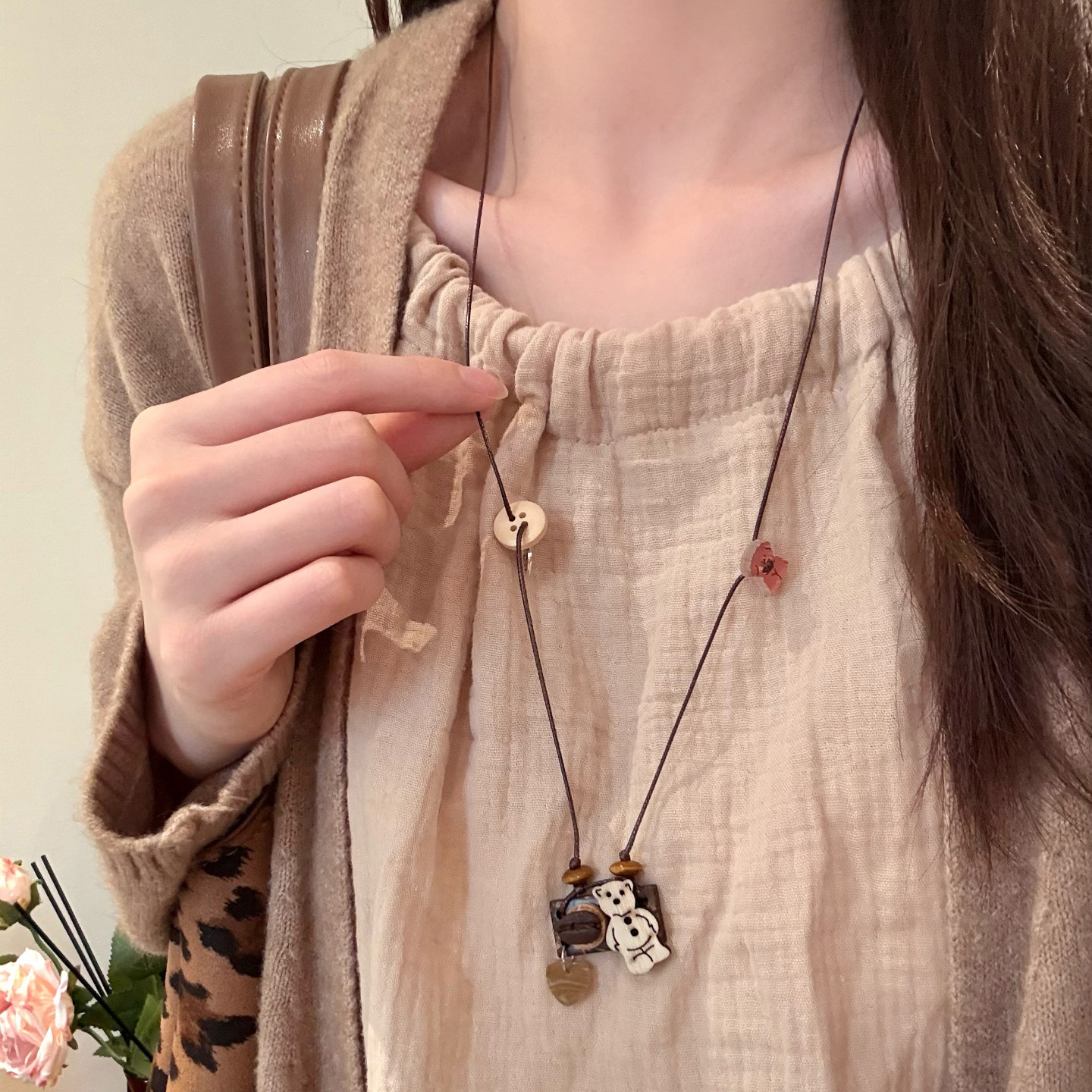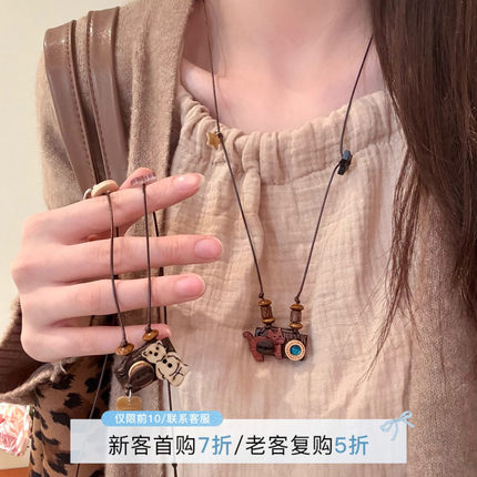 HEY TAO秋冬可爱木质小熊猫咪椰壳项链长款时尚复古毛衣链配饰女