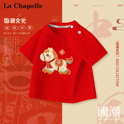 拉夏贝尔男童短袖t恤儿童宝宝红色半袖纯棉新年上衣婴幼儿拜年服