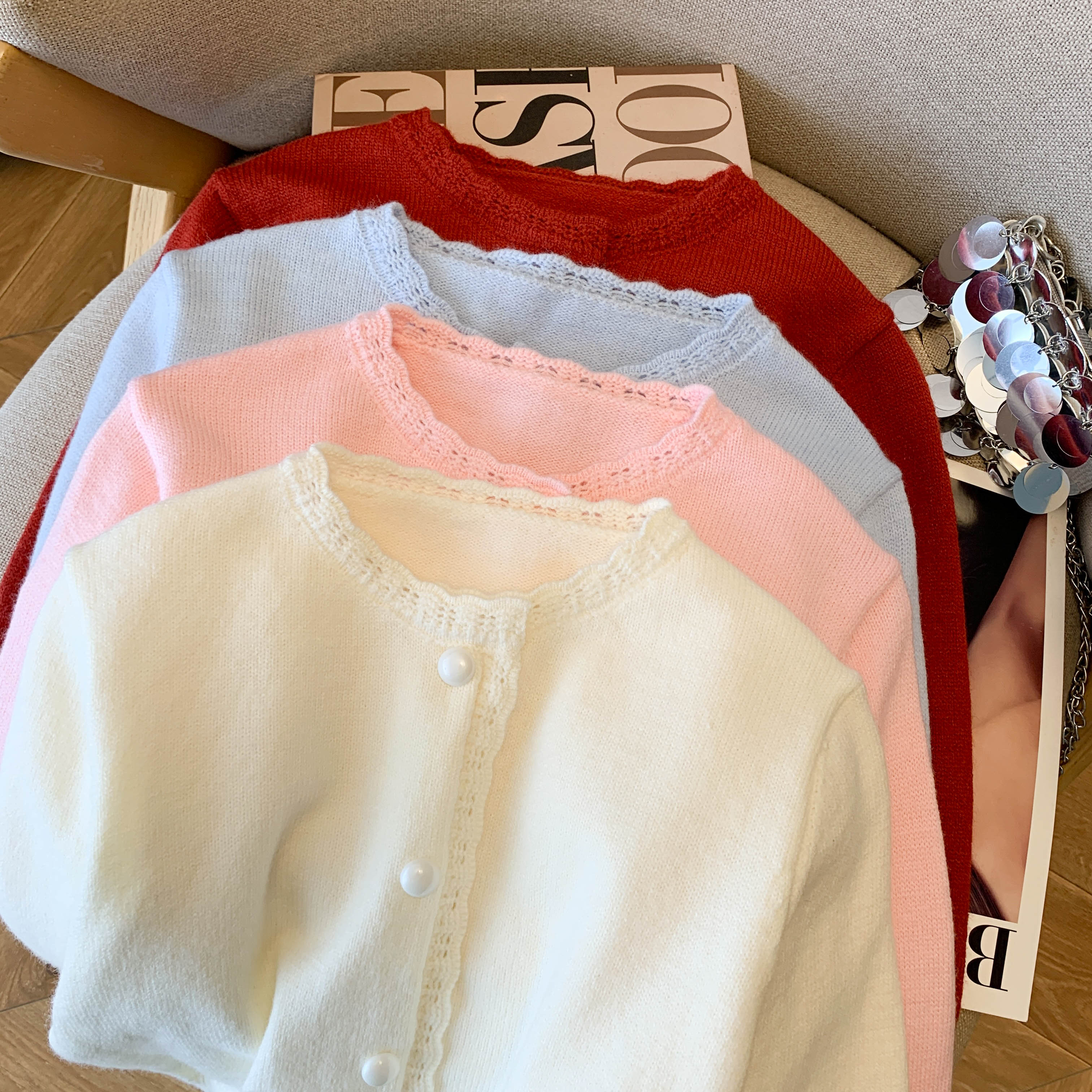 150cm显高秋装女装小个子加小码XXXS花边蕾丝针织开衫长袖打底衫