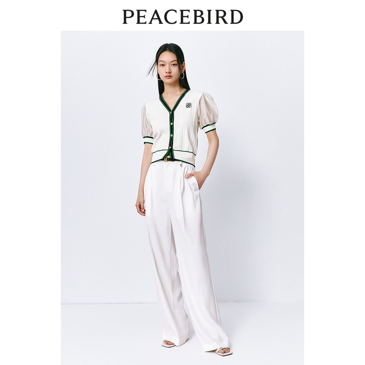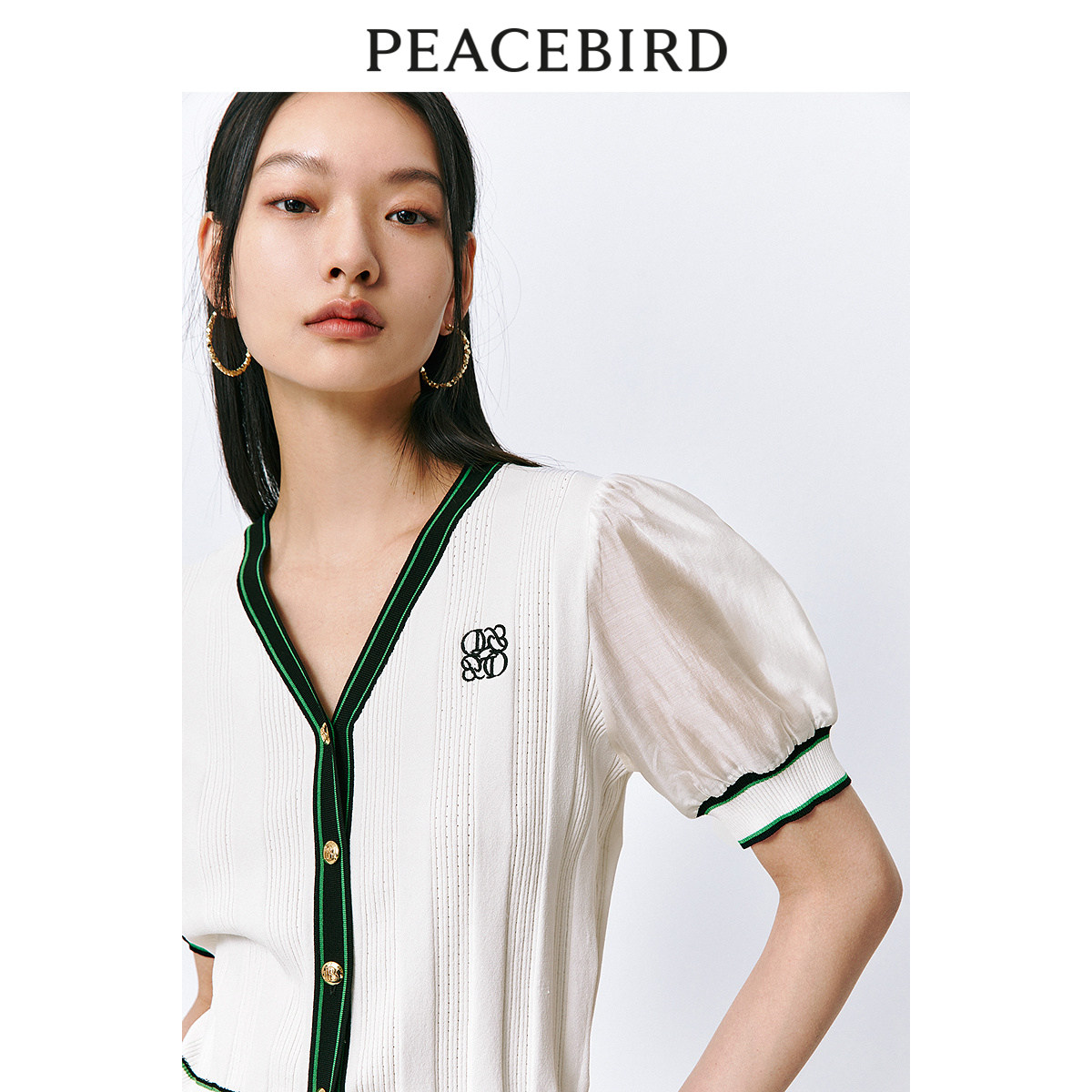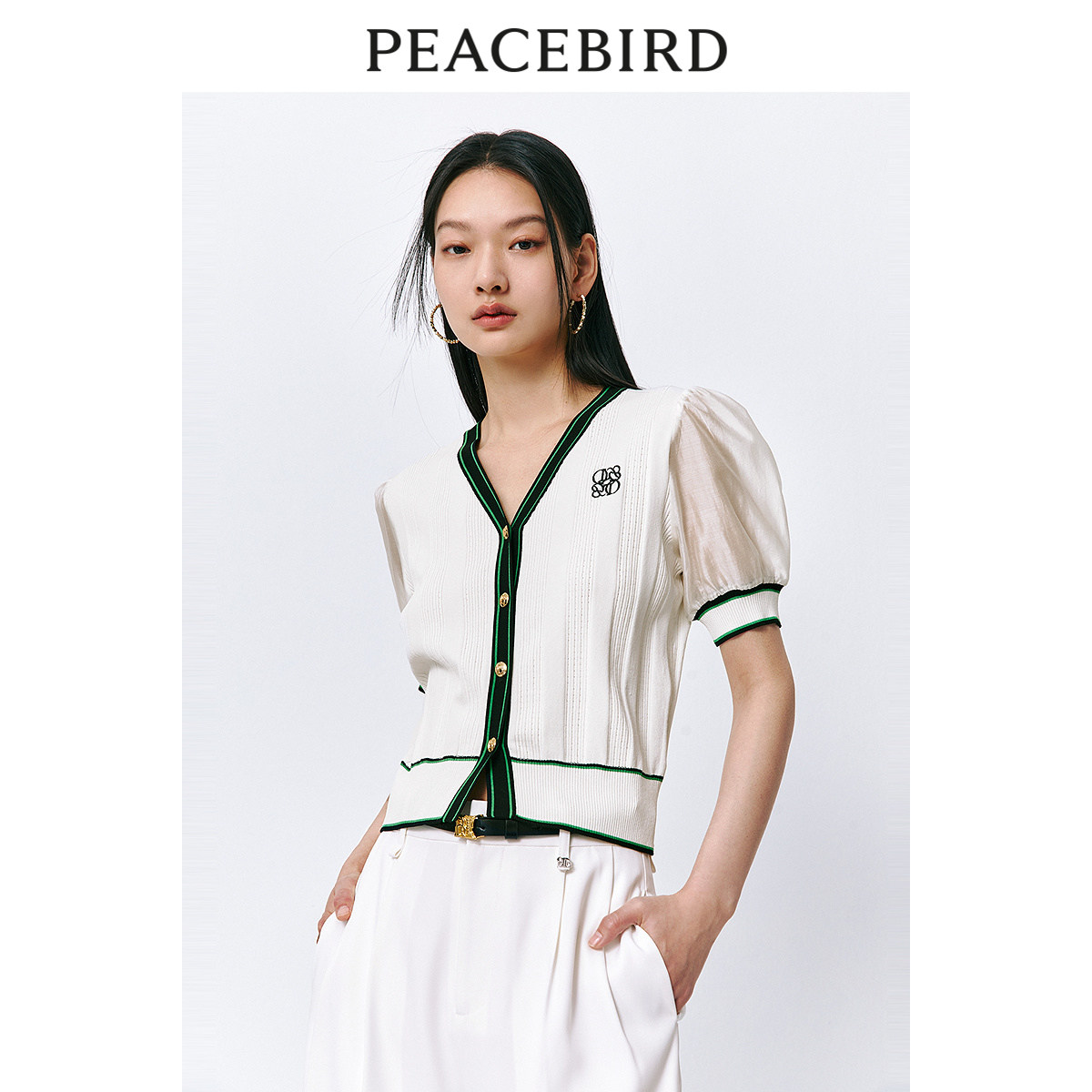 太平鸟短袖小香风针织开衫女2024夏装新款撞色拼接线针织上衣女