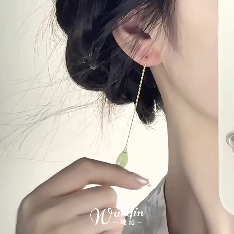 水滴流苏耳钉女款新中式绿色耳线小众清冷感气质耳环古风灵动耳饰