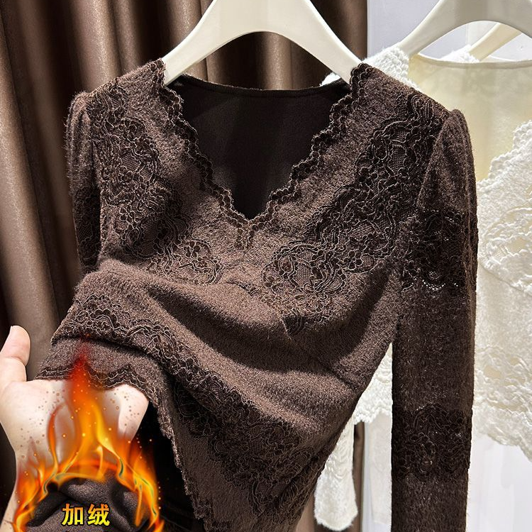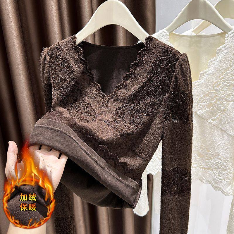 大码加绒加厚蕾丝打底衫女裝胖mm秋冬季V领磨毛叠穿保暖内搭上衣