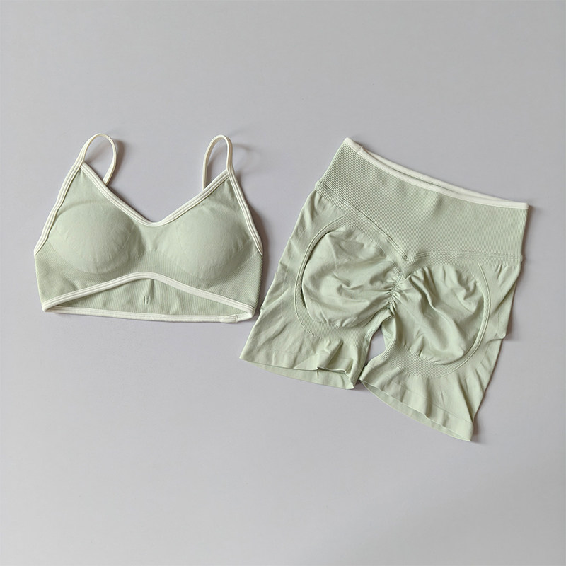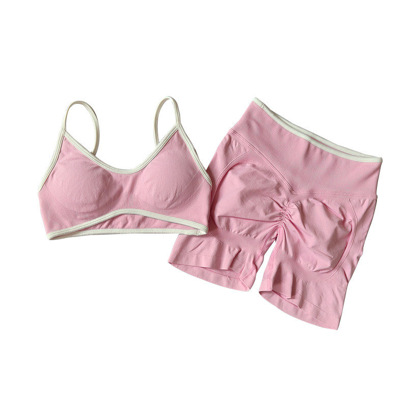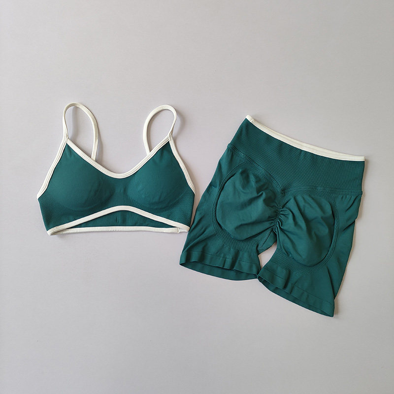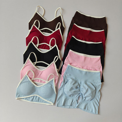 欧美拼色瑜伽套装女带胸垫紧身速干外穿跑步运动健身瑜伽高腰短裤