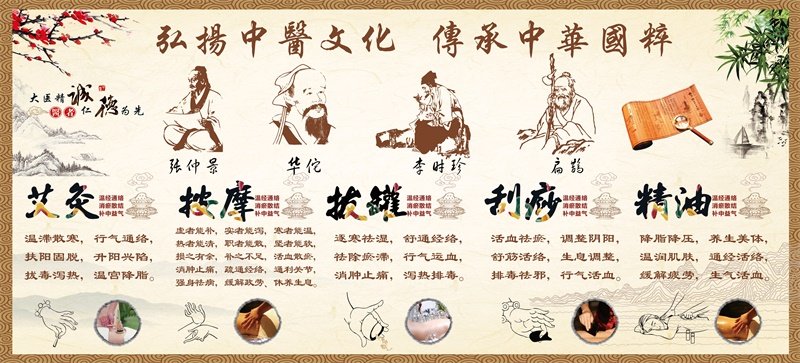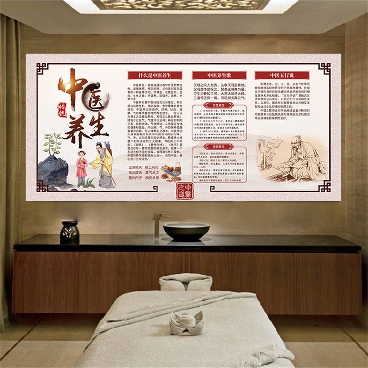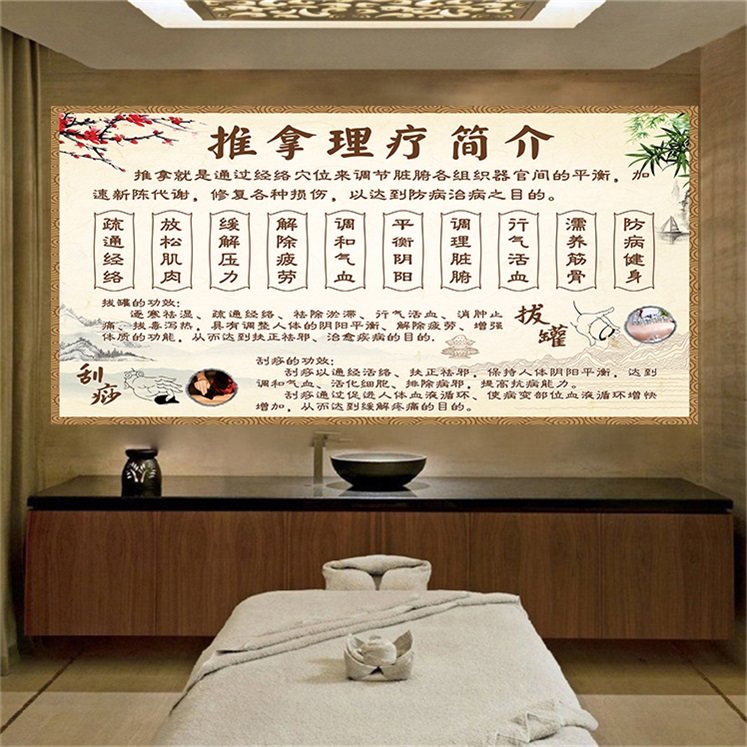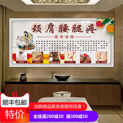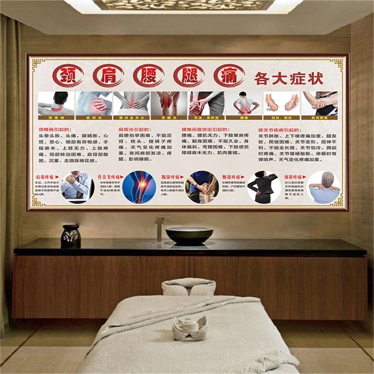 美容院中医养生理疗肩颈腰腿疼海报图推拿拔罐装饰画艾灸针灸挂画
