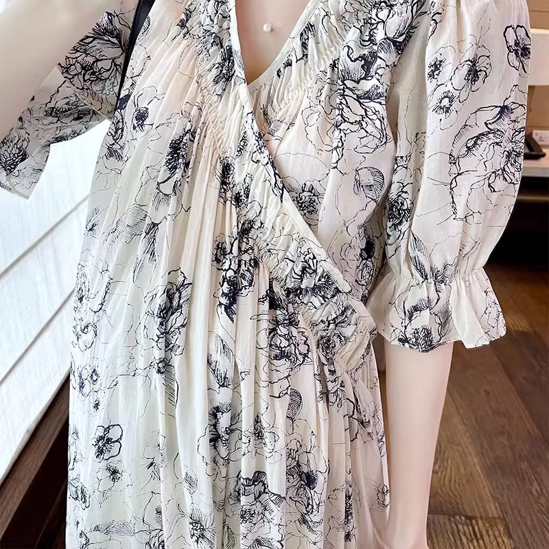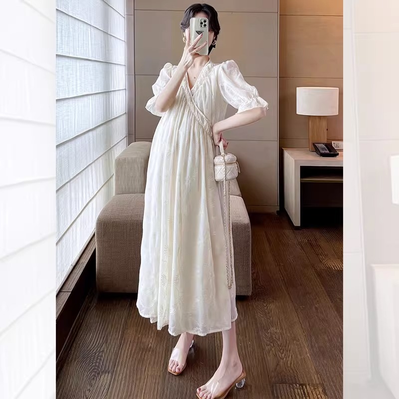 法式开襟孕妇装夏季薄款sV领孕妇连衣裙 设计感小众收腰中长款裙