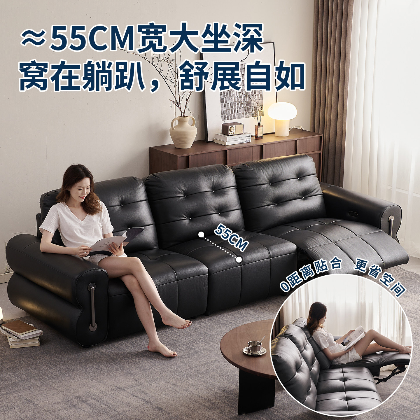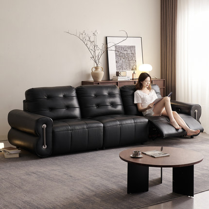 欧派客厅电动沙发2026年新款真皮功能沙发黑色零靠墙抬腿直排沙发