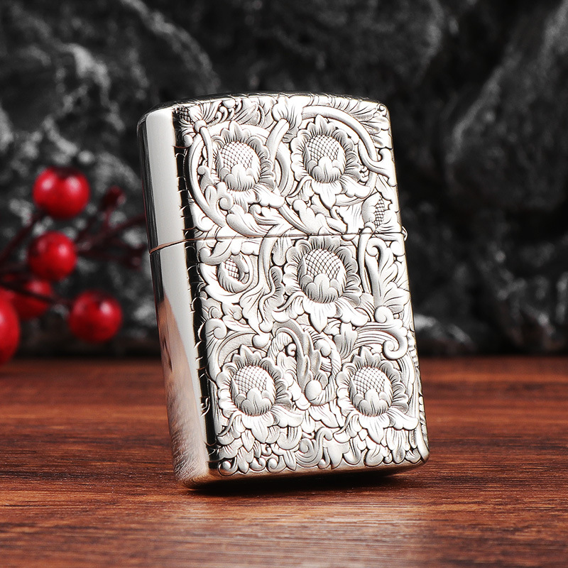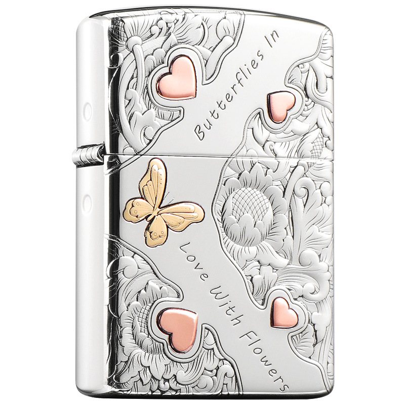 ZORRO佐罗正品纯铜砂轮防风煤油打火机定制浮雕镶嵌蝴蝶花开双面