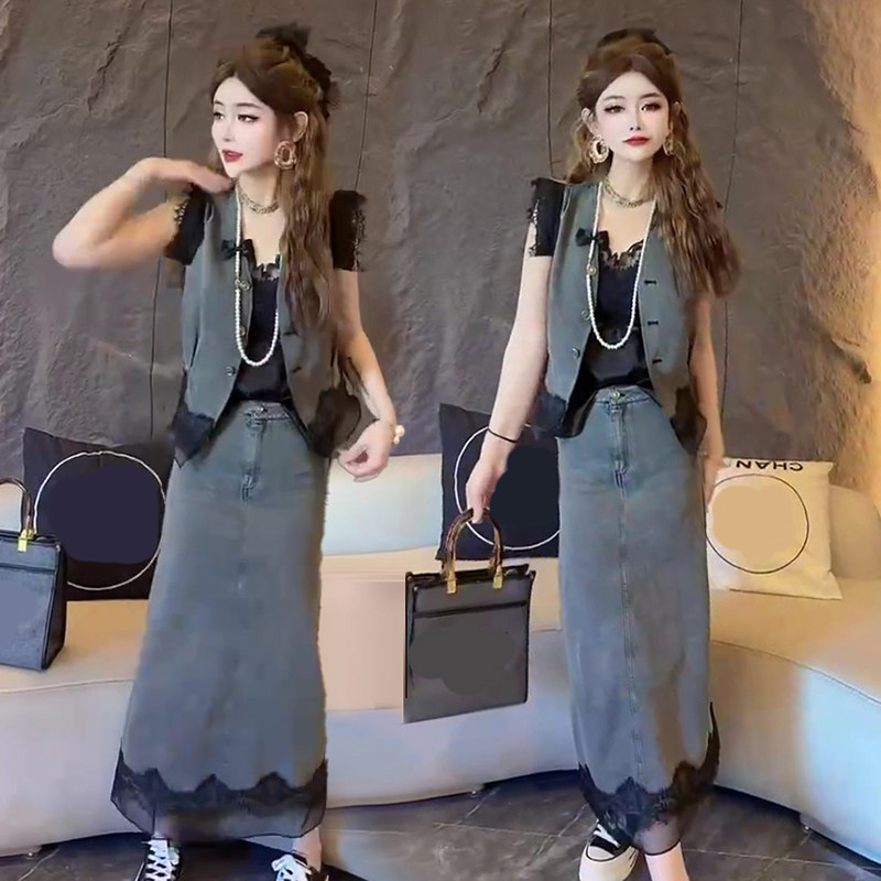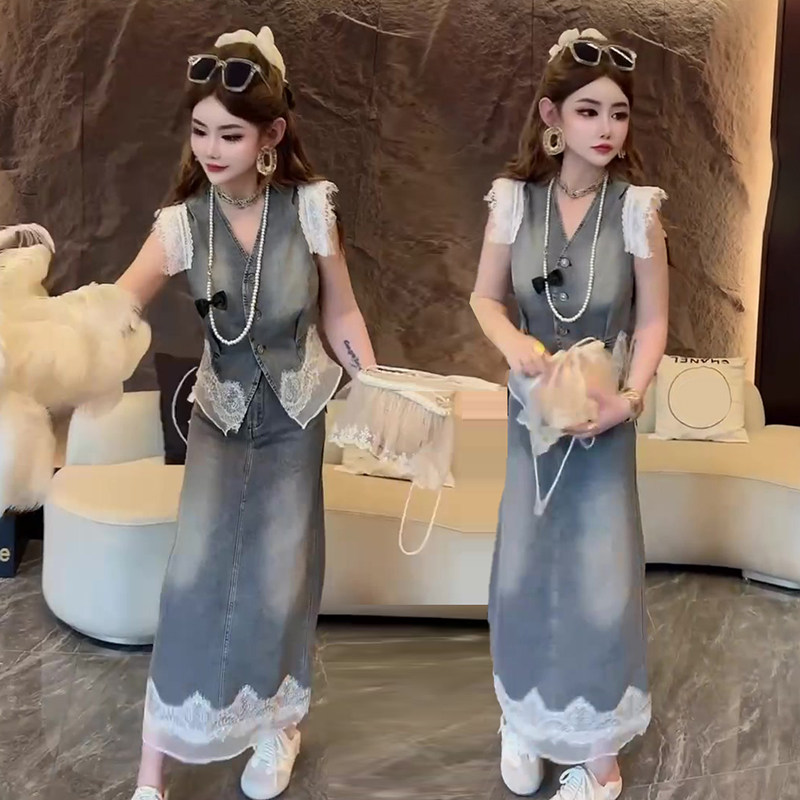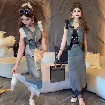 欧洲站2025夏季新款时髦牛仔裙套装女无袖马甲拼接蕾丝高腰两件套