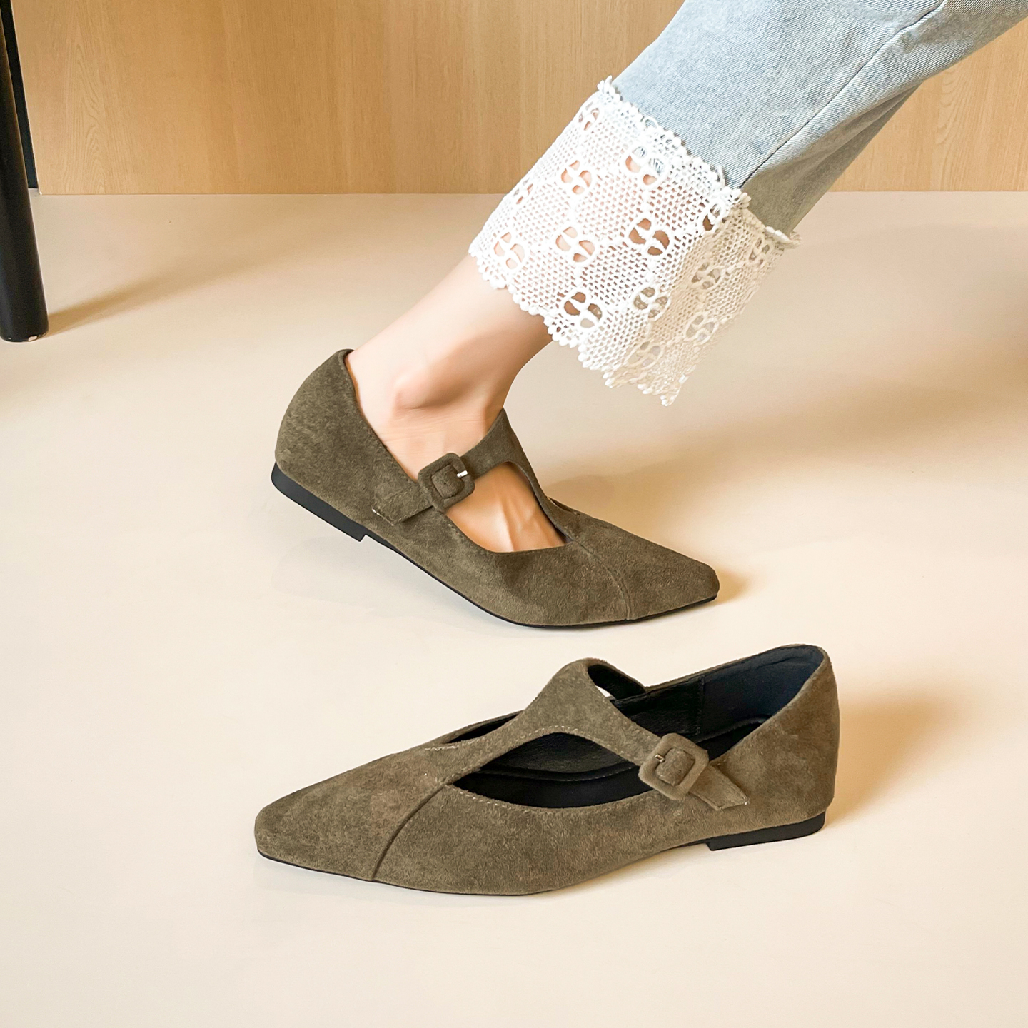 羊皮版~法式绝美尖头玛丽珍鞋女绒面浅口平底气质小单鞋大码女鞋