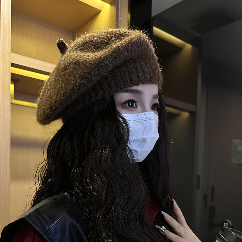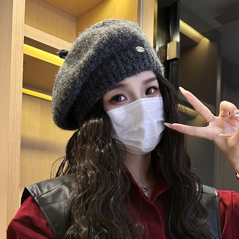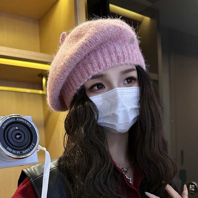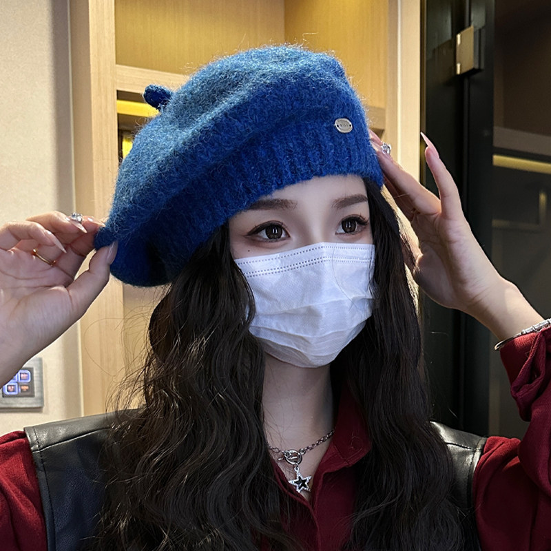 韩版复古金属小标纯色针织贝雷帽子女秋冬加厚保暖百搭毛线画家帽