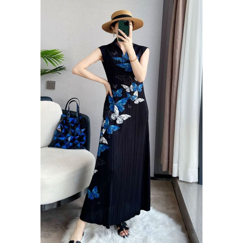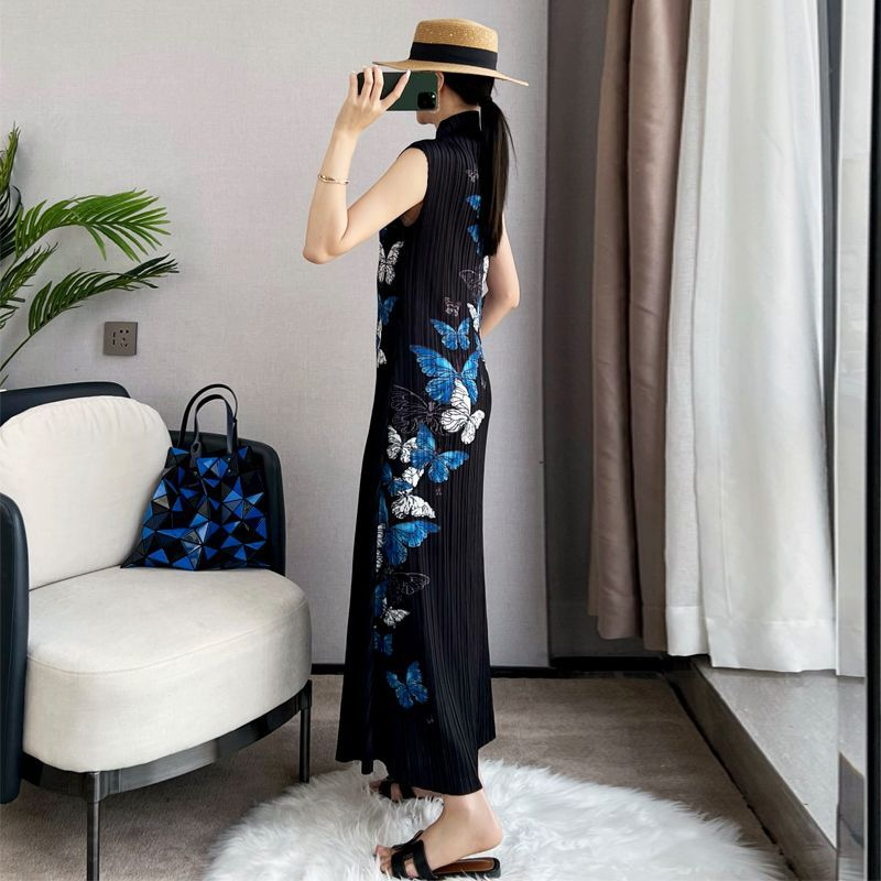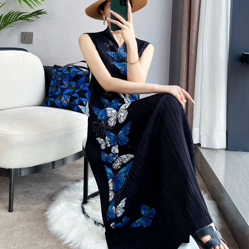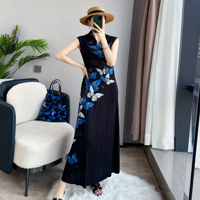 宅褶皱无袖背心连衣裙女2025年夏季新款弹力显瘦打底裙印花